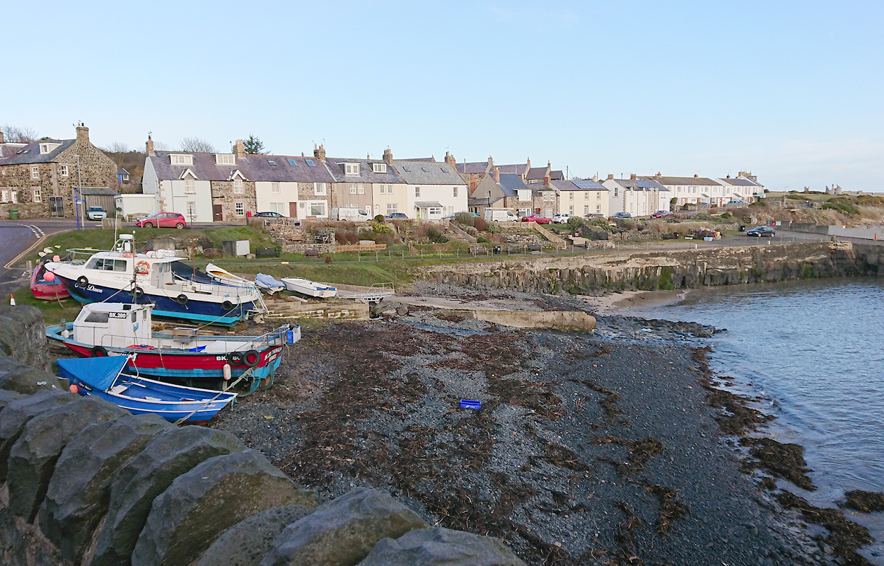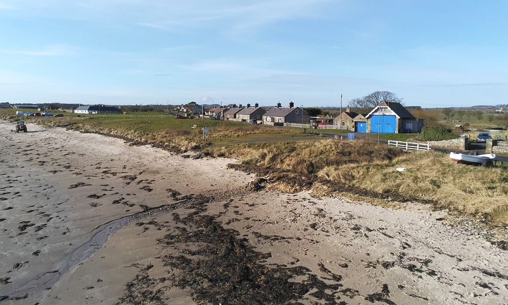 Het vervelend is dat het zo ontzettend hard waait, dat ik nu makkelijk richting Boulmer ren, maar dan weer terug moet met windje tegen. Gezien de afstand die er dan op de teller komt, besluit ik dat dus niet te doen. Ik rommel even met Fleurtje op het strand en maak een kiekje van de huisjes waar ik eigenlijk heen had gemoeten. Niks aan te doen. Ik ga terug. Wafje worstelt zich ook tegen de wind in terug naar de strandopgang.