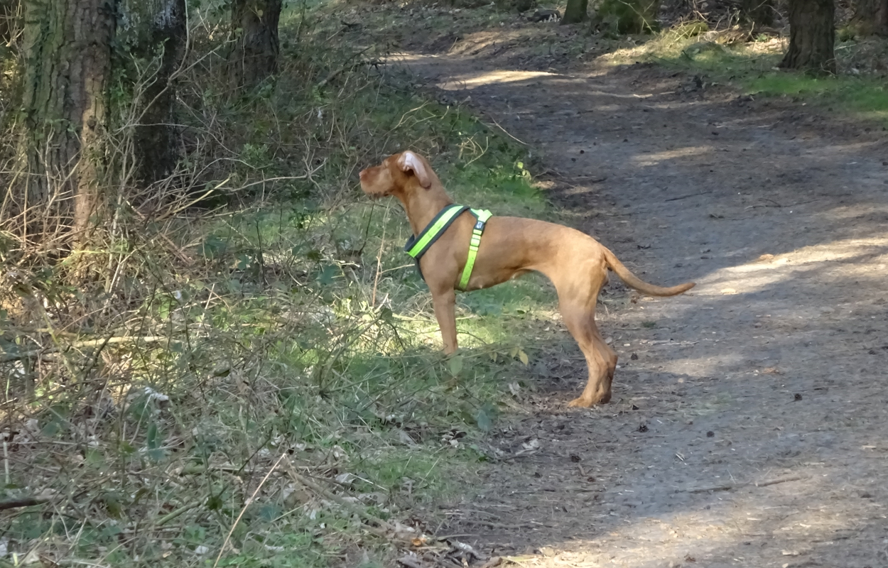 Ik kies voor het pad onderlangs vanaf de bunker en dat is dom want dit loopt veel minder steil dan het parallel pad dat ik natuurlijk op de terugweg ga nemen. Ik had dat beter om kunnen draaien. Maar goed, zo kom ik ook beneden en wat moeilijker straks omhoog. Fleur wacht braaf beneden totdat ik haar aanlijn om over de parkeerplaats te lopen. Het is weliswaar nog rustig maar ik doe het toch even.