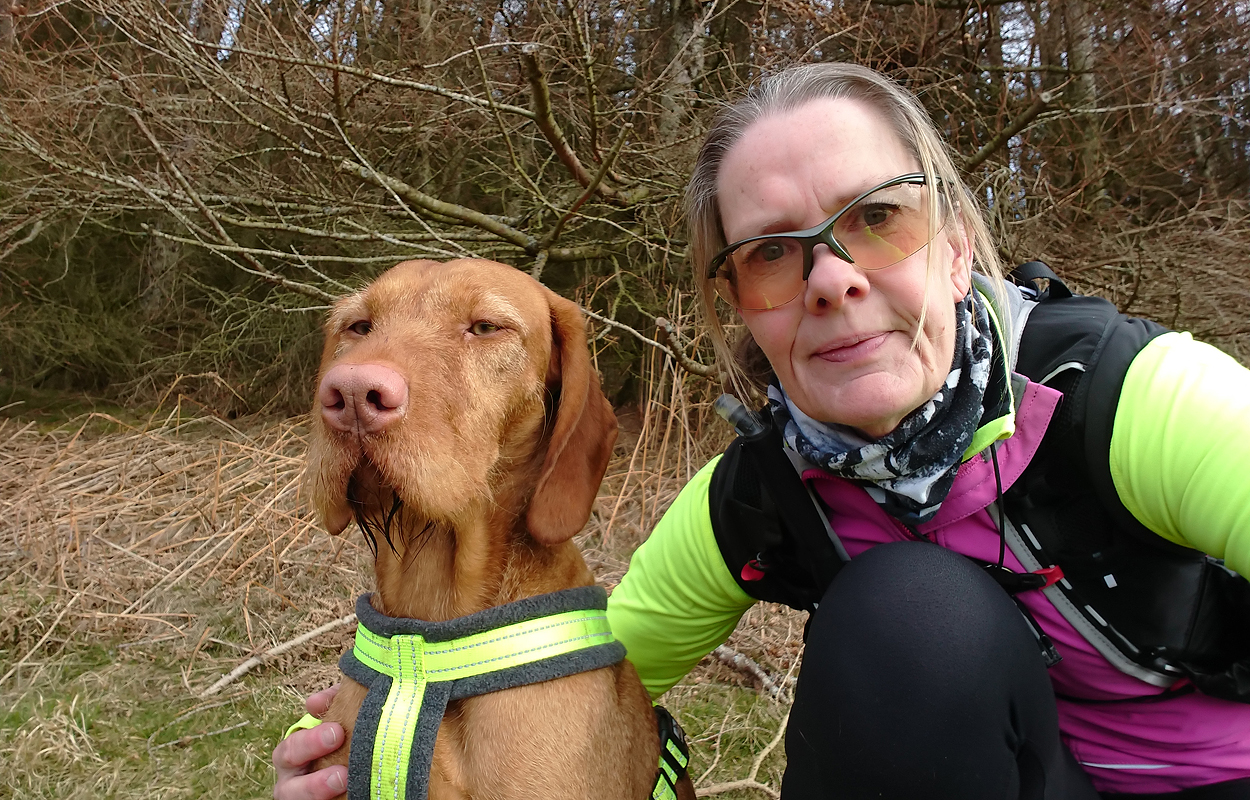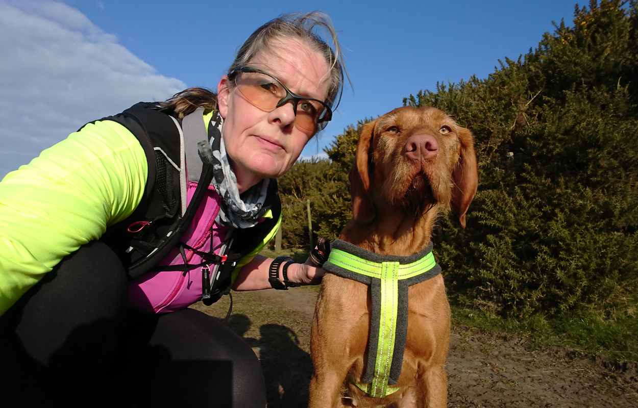 Ik hobbel verder over het laantje, lijn Fleur weer aan en loop over de brug verder. Ik vergeet even dat er een wandelpad langs de weg ligt waardoor ik stom op de weg loop met Fleur naast me. Even op letten op de terugweg! Dit stukje is vervelend en saai. Ik loop op een pad langs de weg, daarna over de stoep langs huizen. Ik herinner me dit stukje nog wel van de ultra maar ik was vooraf vergeten hoe dit was en hoe saai het was. Ook niet leuk voor Fleur want ze moet dus veel aan de riem.
