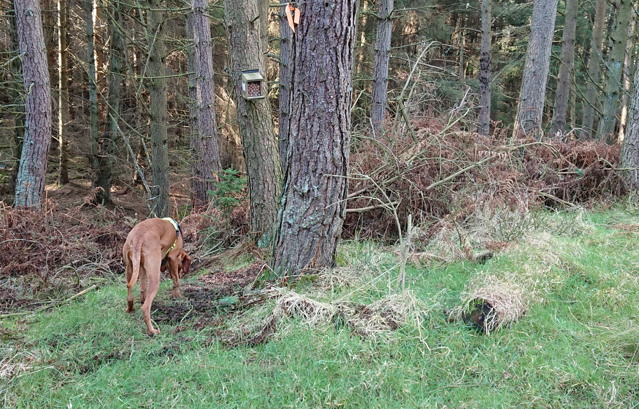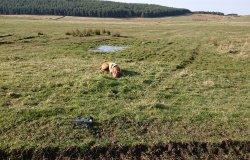 Na wat foto’s en herinneringen gaan we weer dezelfde weg terug. Ik ben benieuwd of ik de wind nu een beetje mee heb want de heenweg was vrij zwaar met de wind. Eerst even langs de boederij en weer langs het water. Als ik even ergens sta te kijken naar een dipper zie ik in het bosje erachter ineens een hert die wat wilde gaan drinken. Nu zie ik dat de grond is afgevlakt zodat de dieren daar uit de rivier kunnen drinken. Normaal zou dat niet opvallen maar dit is duidelijk een vaste drinkplaats. Nog nooit gezien maar wat leuk. Ik blijf doodstil staan en lijn Fleur even aan. Het hert blijft kijken. Dan zie ik nummer 2! Helaas zijn ze toch zo schuw dat ze niet meer tevoorschijn komen uit de bosjes om echt water te drinken. Jammer maar wat een mooie ontmoeting zo!