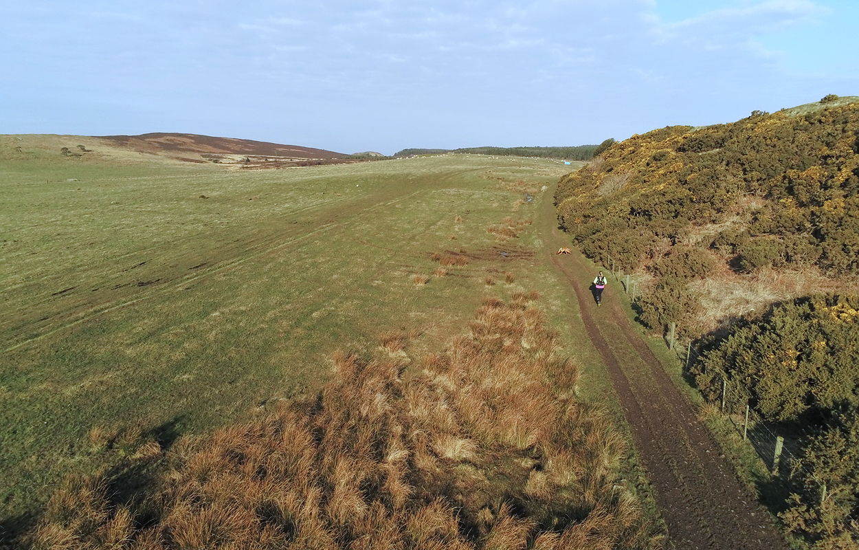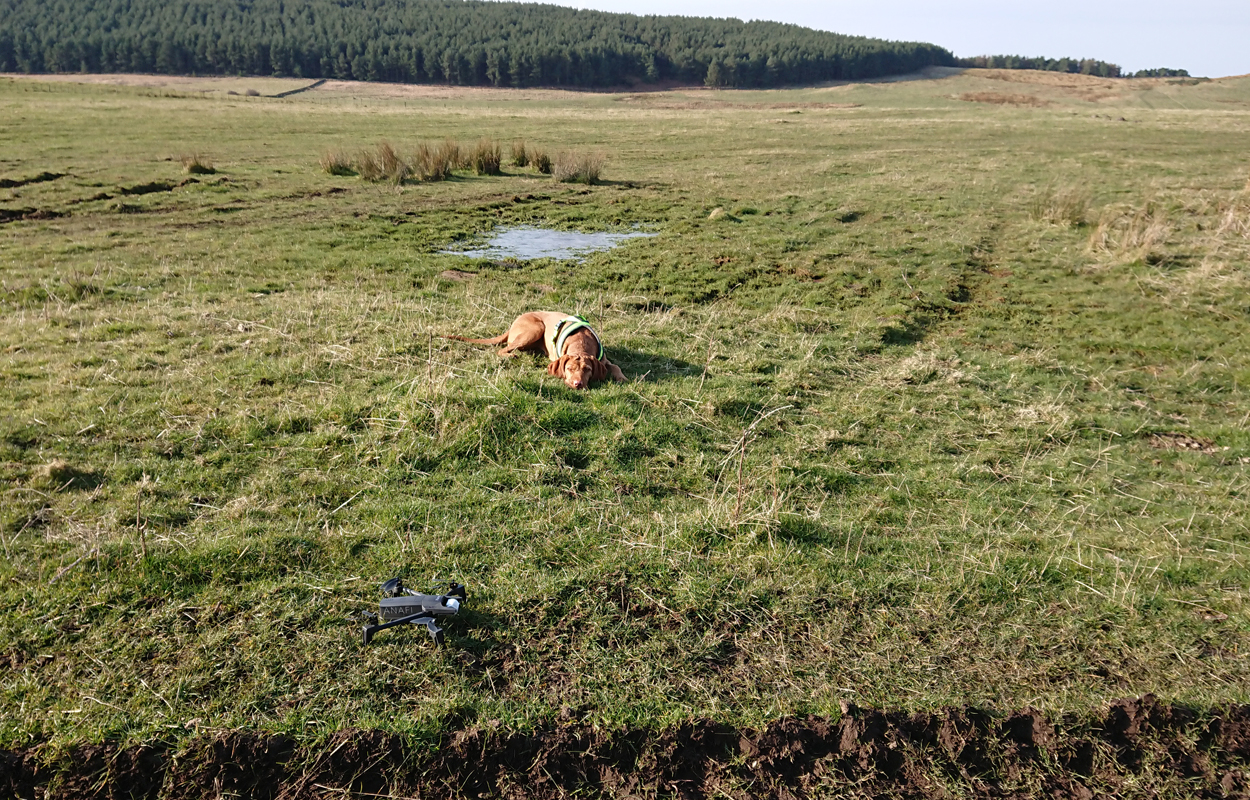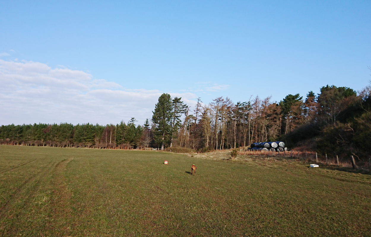 Ik hobbel over straat met Fleur aan de riem en loop over de lovers lane. Hier ook veel wind. Ik ga toch de drone proberen op te laten om een foto van bovenaf te makenook al is er weinig mooi licht. Fleur wacht weer braaf af. Het vliegen gaat niet goed want als ik de drone laat draaien, grijpt de wind het fragiele lichte ding en tolt hij een beetje rond. Gelukkig blijft hij bestuurbaar en kan ik zonder gedoe de drone weer terughalen en op het smalle pad laten landen. Geen goed idee dus met deze harde wind en verder blijft de drone dus in mijn rugzak denk ik.
