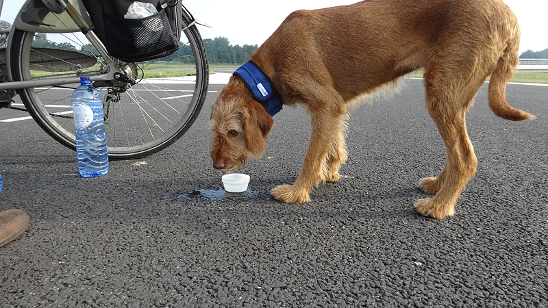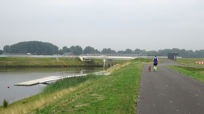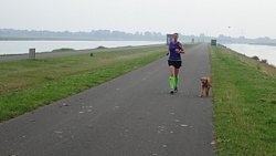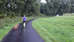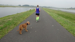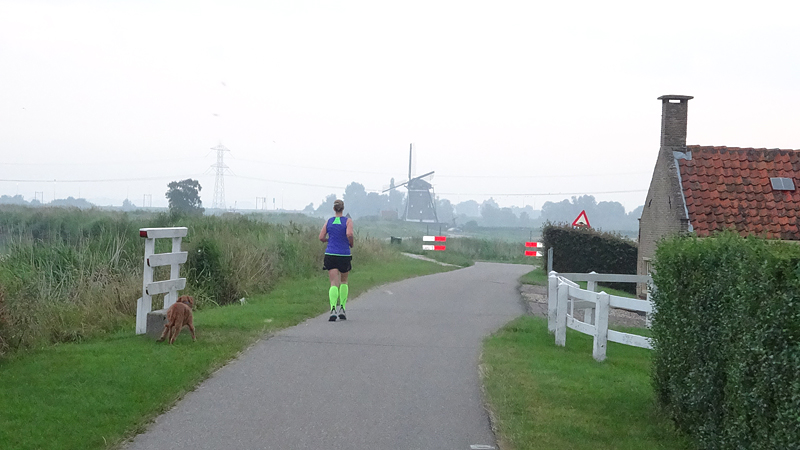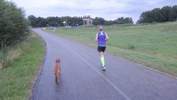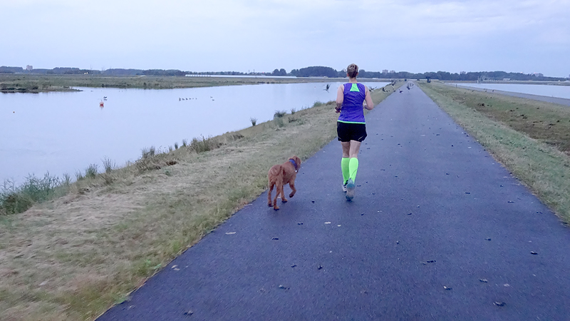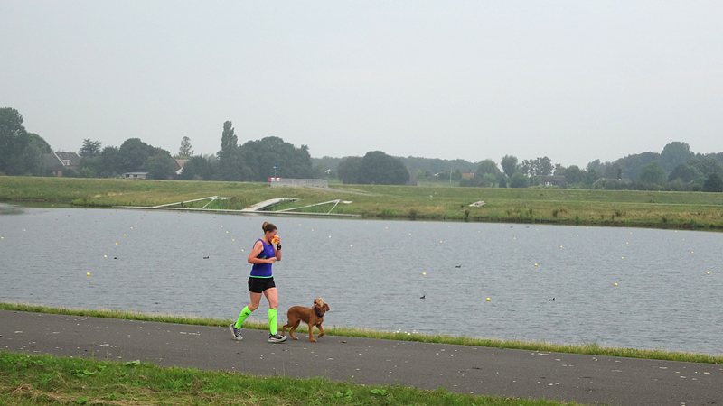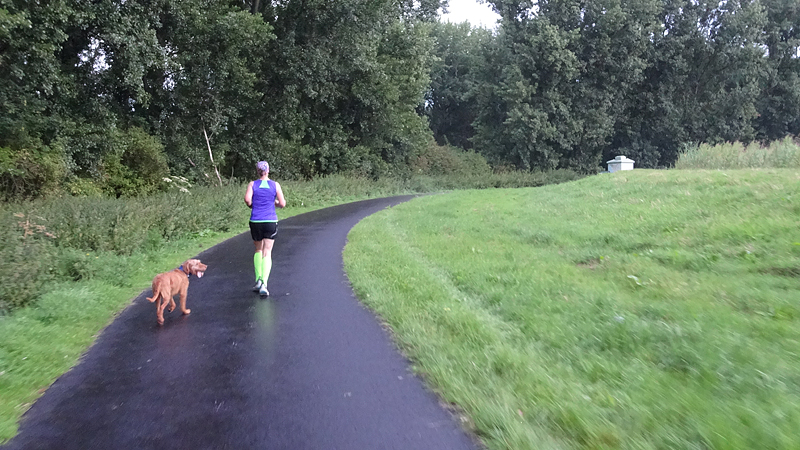 Ik startte weer redelijk vroeg, net voor 7 uur in de ochtend. Helaas scheen de zon toch al uitbundig en was het eigenlijk al heel erg warm. Ik kwam ontzettend moeilijk op gang op de roeibaan. Werkelijk sukkelend deed ik mijn eerste mile op RWR. Ik kroop bijna. Moet dit een tempo training worden? Ik was mijn metronoom ook nog vergeten, dus geen externe prikkel om mijn poten op te tillen dus! Na de mile dan maar beginnen met de temporun. Niet nadenken, gewoon mantra opzeggen en ‘gaan’. ‘Ik ben fit en ik ben sterk…. Nou hahahaha ja hoor. Wafje liep dapper voor me uit. Tongetje uit haar bekkie al. Gossie. Ook al warm.