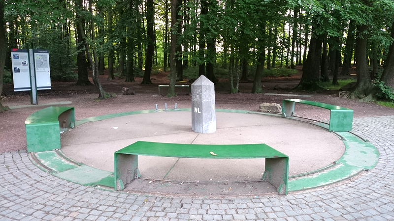 Vanaf dat punt weer verder richting Belgie en weer richting drielanden punt. Dat is op zich een mooie weg en leent zich ook voor even doortrekken. Dat deed ik dus en dat ging prima met mooie hartslag. Daar even uitblazen en foto maken van het punt en de grens zonder de vlaggen. Ook die vreselijke toren even snel gekiekt. Het is echt een drama daar, zo lelijk en met al die vreet tenten. Maar zo vroeg is alles dicht en nog vredig natuurlijk.
