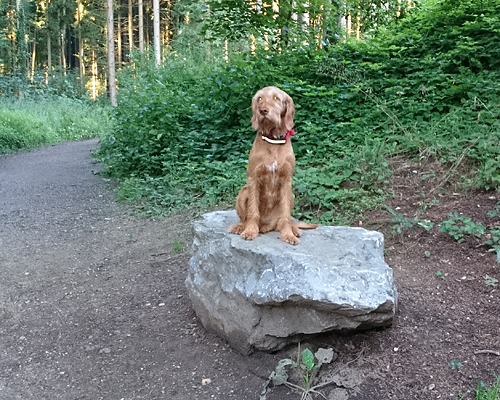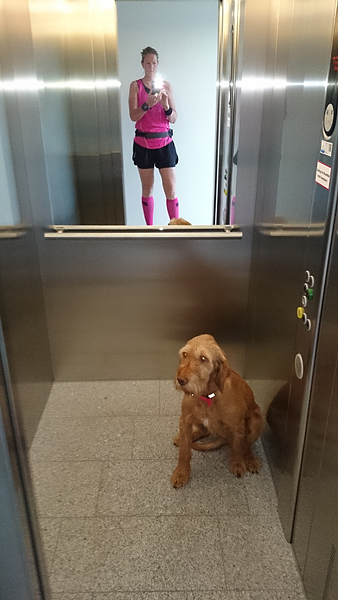 Vandaag wordt een erg warme dag en morgen ook. Daarom besluit ik maar weer in alle vroegte te gaan lopen, dus om 6 uur rinkelt zachtjes mijn wekker alweer. Ik schiet mijn kleren aan en om 6.30 zijn woef en ik al op pad. Even snel een kiekje in de lift van mij en woeffie.