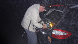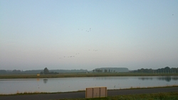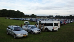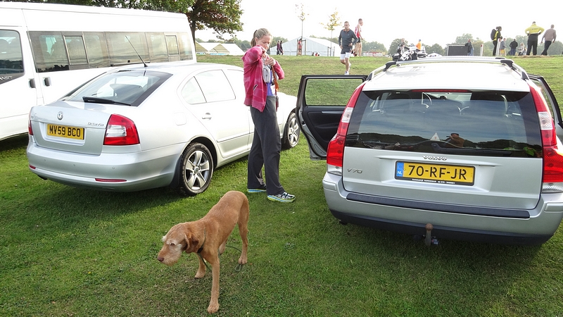 Even na 6.15 rijden we weg van de cottage en hopen rond 08.00 op het parkeerterrein te zijn. Vol goede moed dus op pad. Waf achterin net zoals vorig jaar. Nog even tanken vlak voordat we Nottingham inrijden en even naar het toilet en daarna het allerlaatste stukje naar de parking. Om 08.00 zijn we op de plaats van bestemming en we kunnen weer lekker dichtbij op het (droge) veld parkeren. Zo! Wij staan maar alvast op de plek!