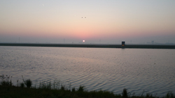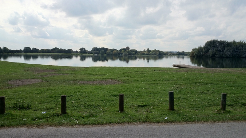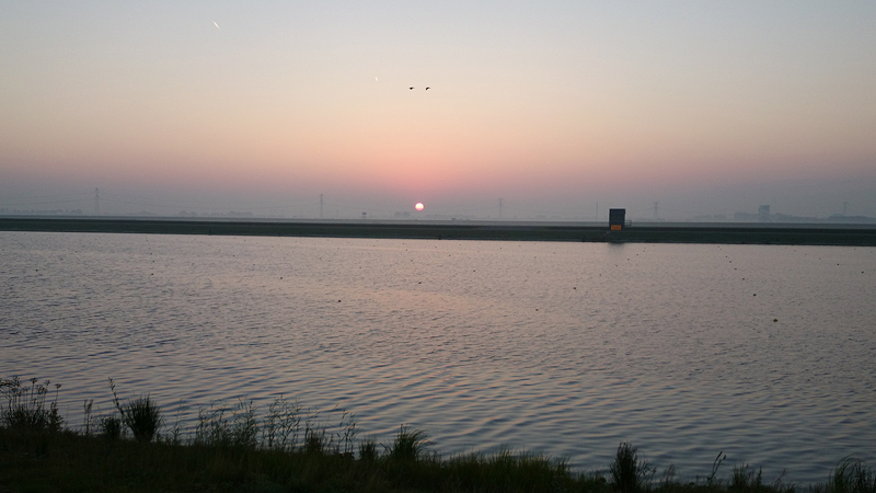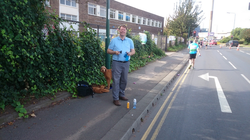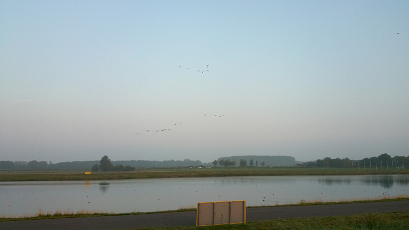Daarna over een drukke saaie weg waar over 1 rijbaan een stroom lopers heen en een stroom lopers terug loopt. Daar tussenin zit een stukje groen en een plas en dat is wel aardig. Ik maak er wat foto’s van.