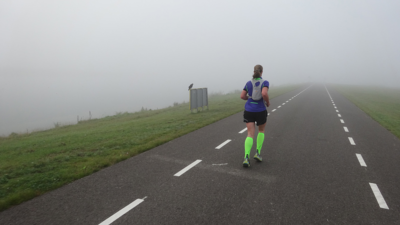 Ik zie S en waf staan en stop even om wat te drinken. Daarna slaan we linksaf en moeten we een bruggetje over. Dat gaat grappig genoeg nog best en ik herken het stuk ineens van vorige keer toen ik het zooltje uit mijn schoenen wilde halen en mijn veters niet meer los kreeg. Deze keer gelukkig geen geklooi met schoenen of iets dergelijks. Alles zit en voelt goed dus dat is weer een opsteker. Zou ook niet weten waarom niet eerlijk gezegd, maar het altijd weer leuk als het ook daadwerkelijk zo is.