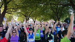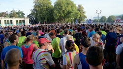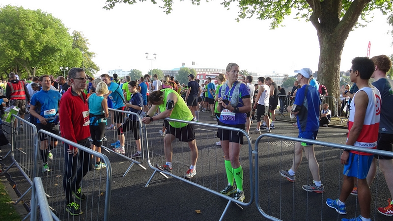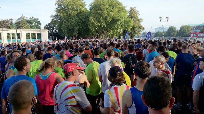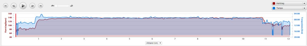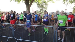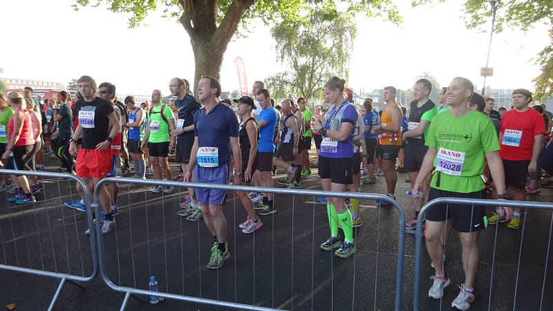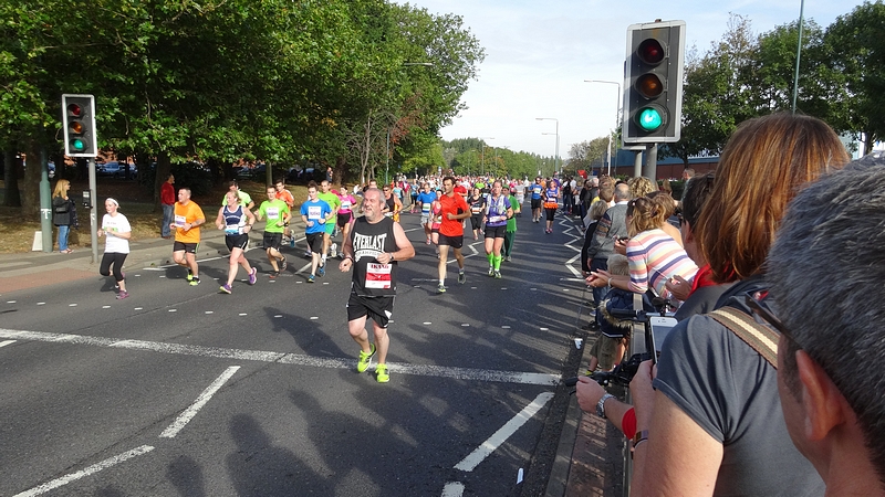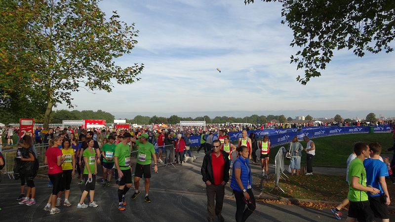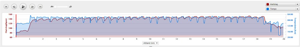 Ik ga van start en let goed op mijn horloge. Ook al hebben we RWR getraind, ik weet al dat door de drukte dit op de eerste km niet zal lukken dus rustig aan dan maar. Dat gaat redelijk goed maar na 1500 meter klapt er ineens iemand met een enorme dreun op de grond naast me. Werkelijk ongelooflijk dat een mannenlichaam dit geluid maakt als het tegen asfalt smakt. Iedereen kijkt om maar aangezien de goede man náást me op de grond slaat, kan ik moeilijk gewoon doorlopen alsof ik niets gezien heb. Gelukkig is de man zo onder invloed van de adrenaline dat hij eigenlijk niks merkt van alle verwondingen en weer doorloopt. Mmmmm. De rest van mijn eerste lap gaat verder prima. Het is vrij warm, maar ik vind het nog niet enorm heftig qua weer. Ik zie dat ik op zich op streeftempo loop, maar wel aan de snelle kant dus ik besluit ietsje gas terug te nemen omdat ik er nog lang niet ben! Als ik in de getalletjes loer achteraf, vraag ik me af of ik dit beter niet had kunnen doen. Tijdens de trainingen liep ik ook dit tempo en liep dat bijna ‘automatisch’ met een prima eigen cadans op ademhaling. Nu ben ik netjes gaan vertragen maar vooral qua cadans en niet zozeer qua paslengte. Gevolg: weliswaar langzamer maar zwaarder en vermoeiender. Ik weet het niet, maar het is wel opvallend.