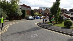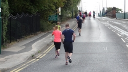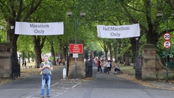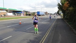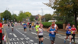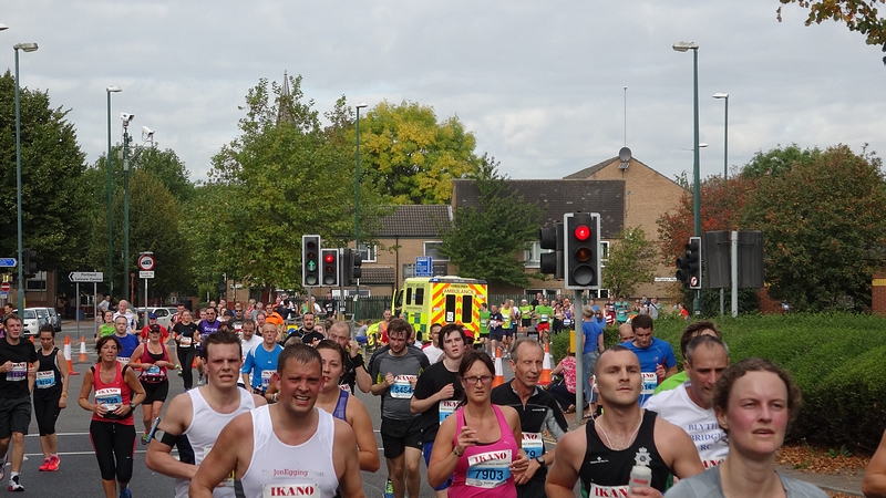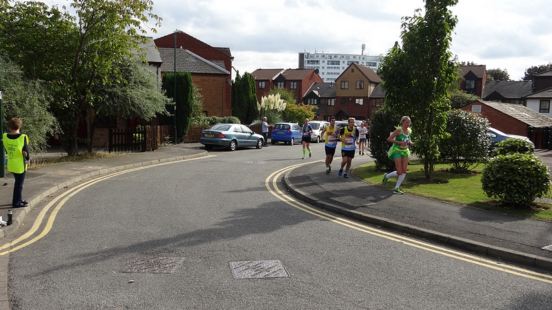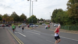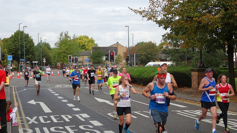 Op 12 mile splitst de marathon zich van de halve marathon en voert weer langs een woonwijk.