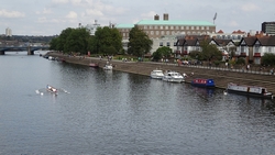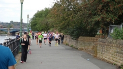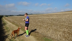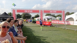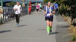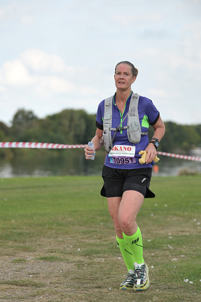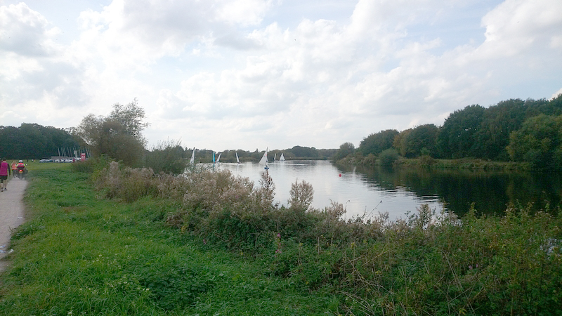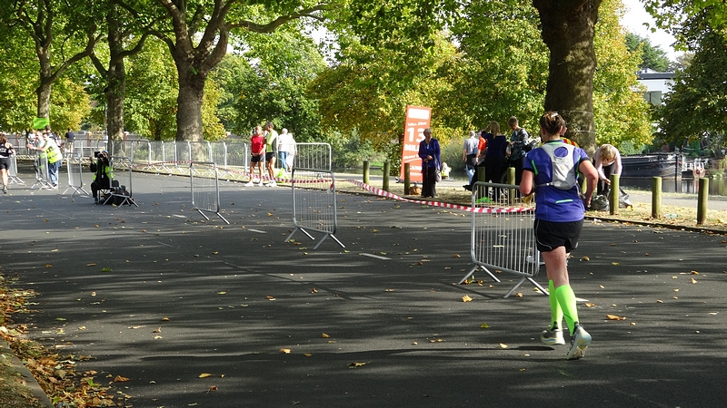 Na de roeibaan weer een stukje onder een brug door. Mijn schoenen zien er werkelijk niet uit want het hele laatste stuk was onverhard en stoffig. Je loopt daar langs het water over een of ander paadje. Ik vind dat prima maar ik kan me voorstellen dat er mensen zijn die deze route dus niet leuk vinden en liever over de weg lopen. Maar de eerste helft vond ik nou net weer niks qua omgeving dus zo vindt iedereen wel weer wat. Toeschouwers zijn er ook niet trouwens en met een 1400 man op de marathon lopen er ook niet echt veel mensen op dat laatste stuk. Als je dus anderen nodig hebt om je aan op te trekken, dan moet je hier vooral niet gaan starten want dan heb je een probleem.