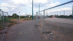 Bij de laatste stop bij S voor wat water loop ik een nieuw stukje. Ik kan nog niet zien waar we het water oversteken. Hoe ver is het nou nog? Uiteindelijk loop ik weer door een afschuwelijk stukje route met allemaal hekken vanwege wegwerkzaamheden. Gezellig!