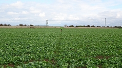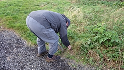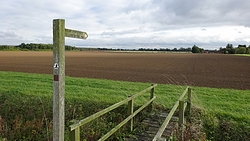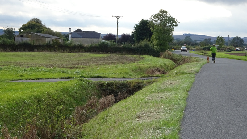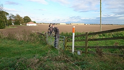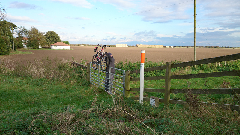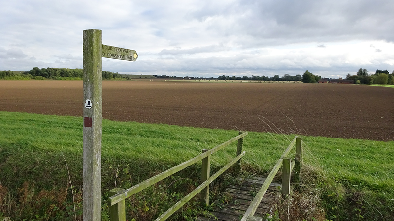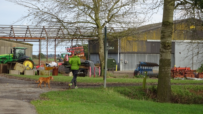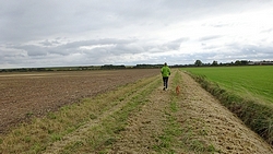 Eerst lopen we door een omgeploegde akker waar een boer nog netjes een soort pad doorheen heeft getrokken maar vervolgens staan we voor een keurige lege akker zonder pad. Dat is nou jammer want dit is toch echt een officieel pad en een officiele route. We besluiten over het gras richting de weg te gaan, en vanaf daar weer de route op te gaan.
