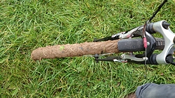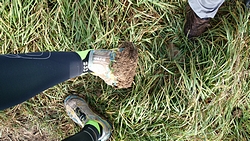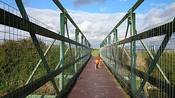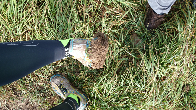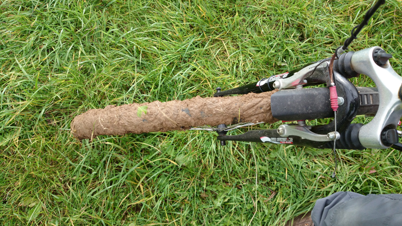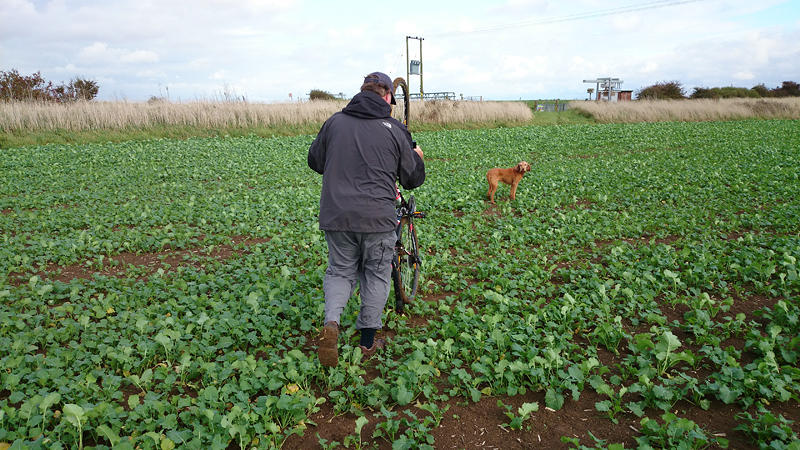 Na ruim 6 kilometer zitten we nog steeds op de gepijlde – saaie – route en staan we ineens voor een soort knollenveld waar wel een soort pad is gemaakt, dwars naar de voetgangersbrug. Daar moeten we dus blijkbaar heen. Ik loop richting de brug en het valt me op dat het heel erg zwaar loopt ineens. Ik kijk eens goed en zie dat ik al een kilo klei/modder aan mijn schoenen heb zitten. Vooruit kom ik bijna niet meer en als ik om kijk, zie ik S ook ploeteren met de fiets. Shit. Ik schiet in de lach en wil een foto maken van S. maar die roept verwilderd dat ik door moet lopen omdat hij bijna weg zakt in de akker. Ja klopt. Ik ook! Hij komt tot stilstand en daarmee zijn we aardig in de bonen want vervolgens hebben we (werkelijk) ruim een half uur nodig om de schoenen en de fiets te ontdoen van de enorme bonken klei.