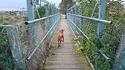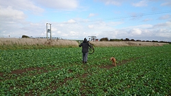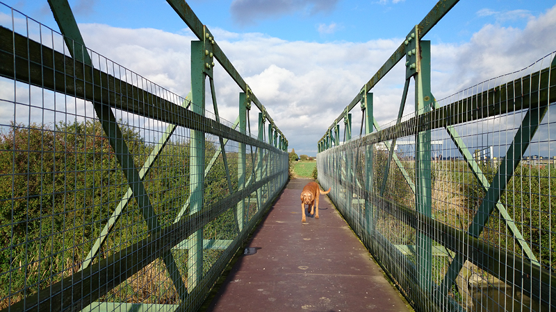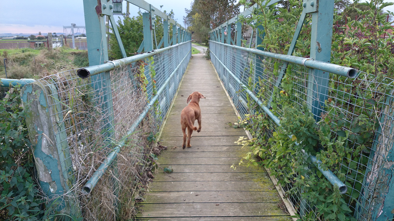 Inmiddels worden we natuurlijk steenkoud en stijf van dit gedoe en we zijn pas op de helft! Gelukkig is het droog en komt het zonnetje af en toe even kijken, en woef vindt het allemaal best.