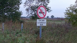 Op de terugweg besluiten we toch nog even met de auto naar dat verrekte reservoir te gaan. Ook al is het nat en donker, we willen nu wel eens zien waar we nu omheen zijn gelopen. We rijden dus een stukje terug en parkeren bij het reservoir waar we een verkeersbord zien om automobilisten te waarschuwen niet met een fiets op het dak onder de slagboom door te rijden. Dat waren we al niet van plan!