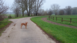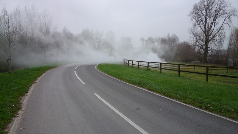 Maar het feit alleen al dat ik voor het eerst sinds (ruim) 3 weken weer een rondje liep met waf, maakte me al zo blij dat het me niet zo kon schelen dat ik verkeerd bezig was. Dan maar even lekker doordraven! Ik ging er ook eigenlijk van uit dat het draven voor de bal goed zou zijn. De bal is veel zachter en kleiner, en door beweging is het vast makkelijker om alles weer af te voeren. Onderweg nog een raar gedoe met een drone en een rookmachine waarvoor ik moest wachten. Later zag ik pas dat ze opnamen aan het maken waren van een auto die door de mist kwam aanrijden blijkbaar.