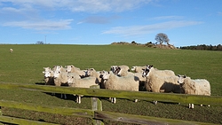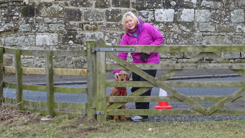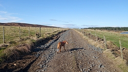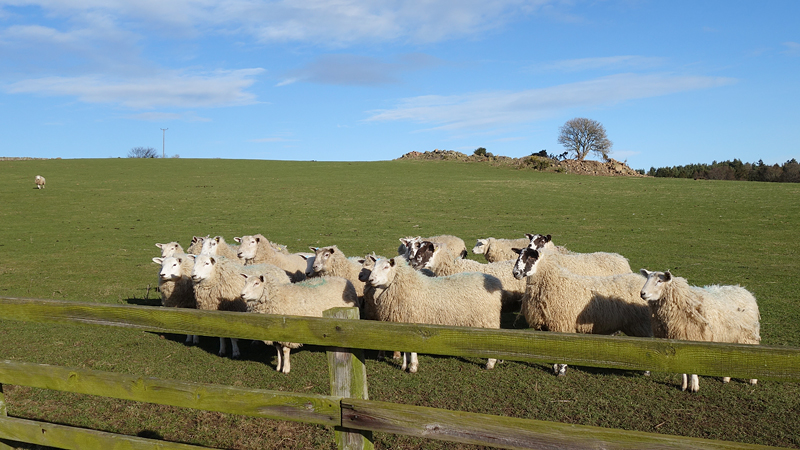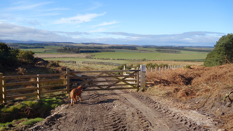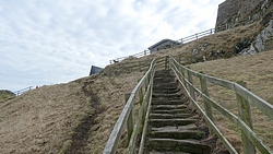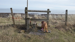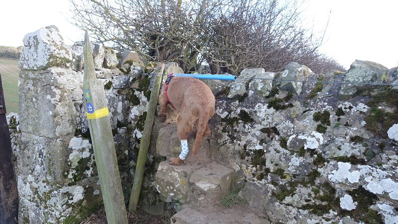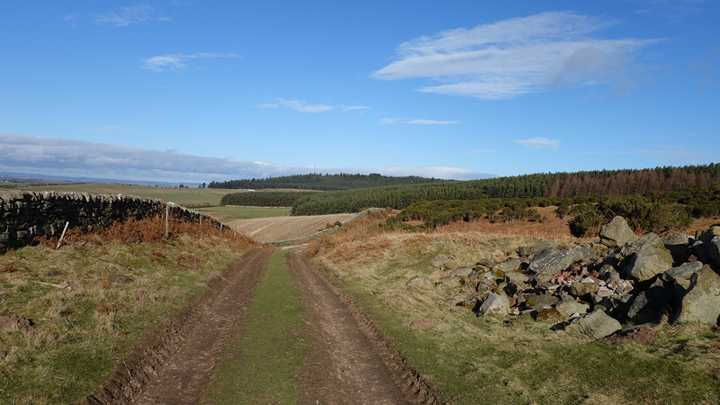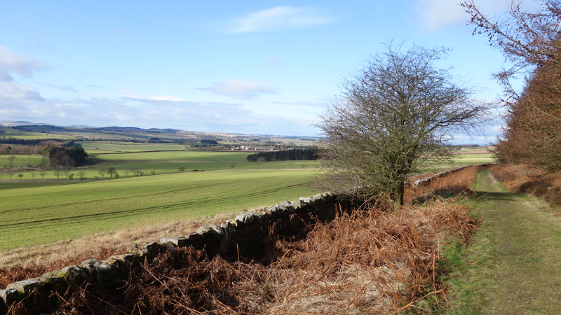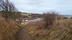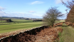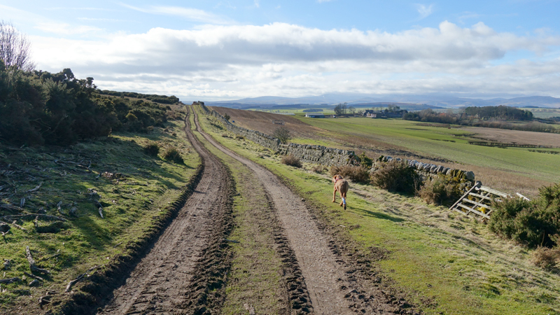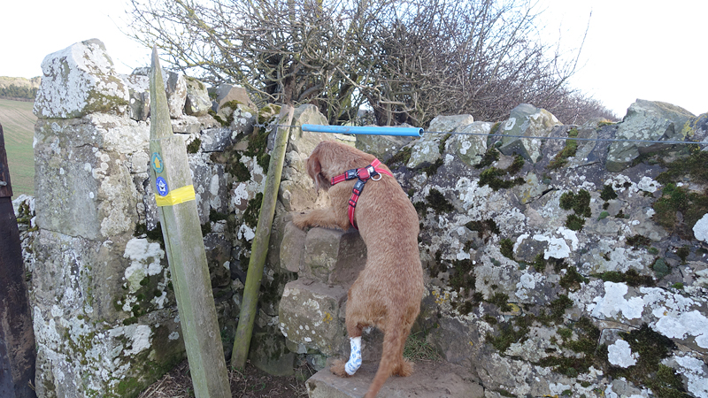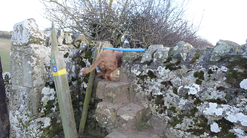 De spoorbrug onderdoor en weer even klimmen over een veld. Oppassen dat je niet meteen verzuurde benen krijgt op die heuvels want het is niet kinderachtig. Daarna weer even naar beneden richting de weg van richting Alnmouth.