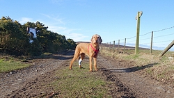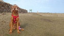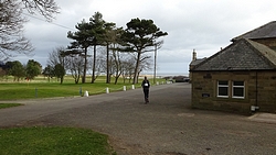 Ik loop tegen de heuvel op naar de golfbaan. Het pad langs de baan is prima begaanbaar zonder modder en dat is fijn. Ik ben alleen eerder bij de golfbaan dan A. en S. want ze komen net vanaf de parkeerplaats aangelopen. Vorig jaar stonden ze al op het strand en keken de verkeerde kant op waar ik bleef. Nu zijn ze dus nog helemaal niet op het strand!
