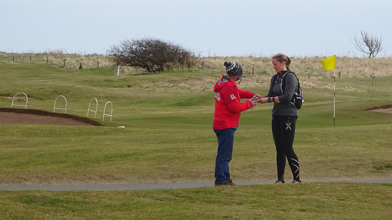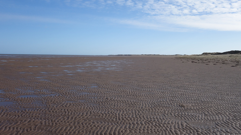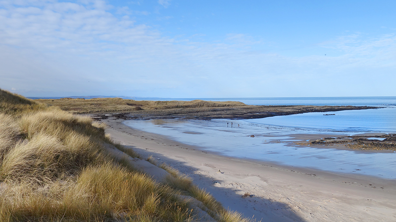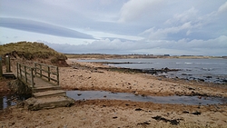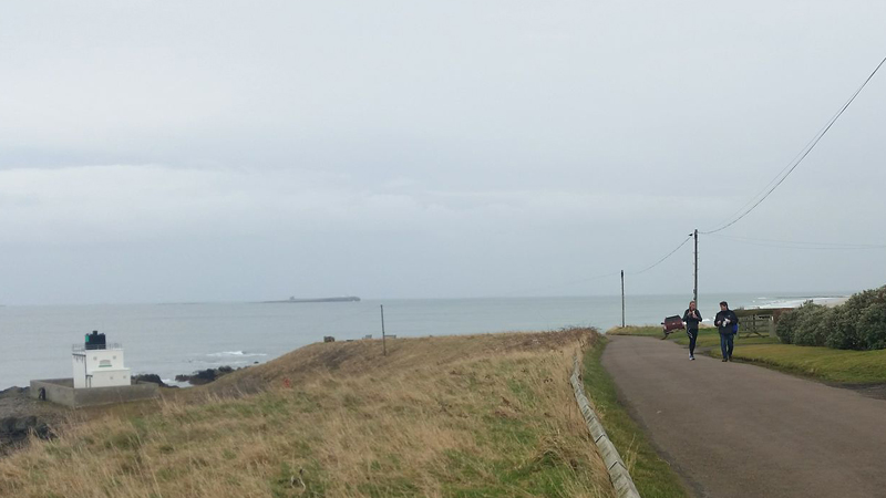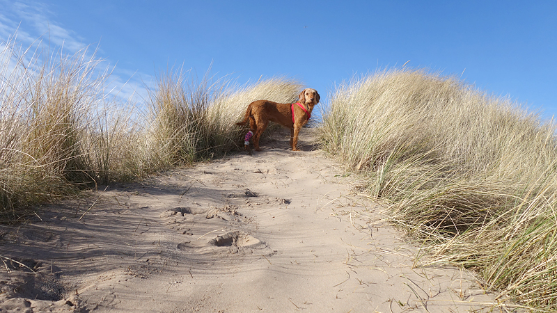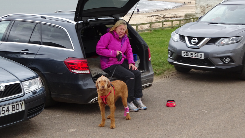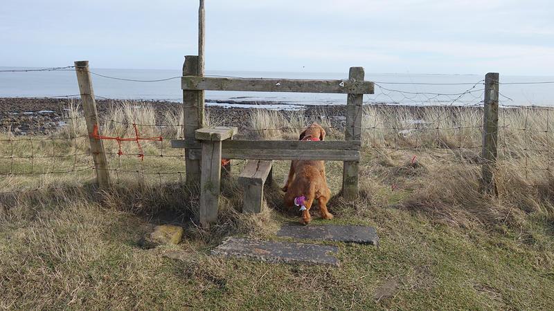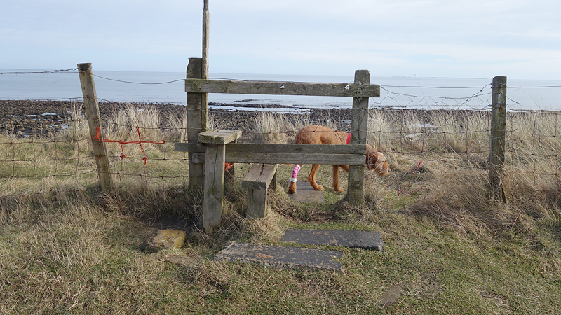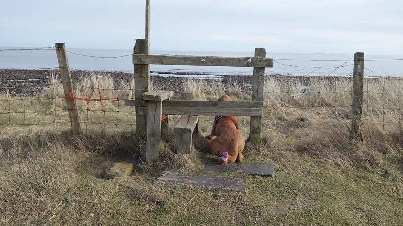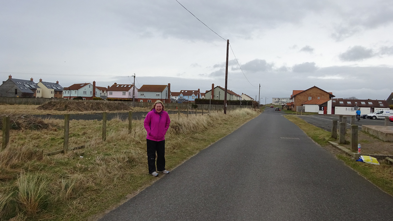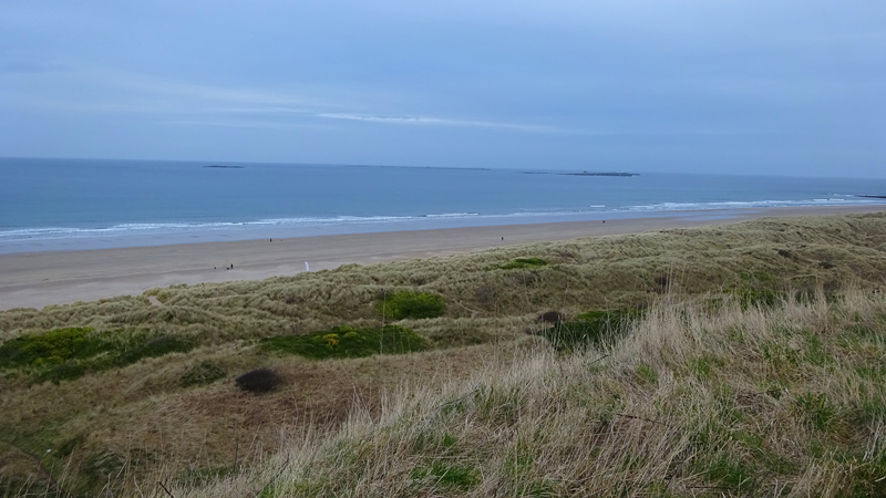 Van Beadnell via de duinen naar Seahouses. Dit traject heb ik niet gedaan tijdens de verkenningen dit jaar. Ik kijk naar het strand en twijfel. Het is heel smal en zal dus zacht zijn. Ik sla linksaf en vervolg mijn weg langs het fietspad. Dat is iets langer en loopt op en neer maar loopt toch beter. Na de golfbaan in Seahouses sla ik rechtsaf en voeg me weer op de route. Door Seahouses en daar zie ik A en S weer. Ik herinner me nog zo goed dat ik hier vorig jaar met wafje liep!