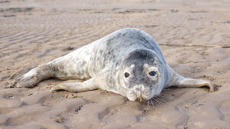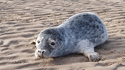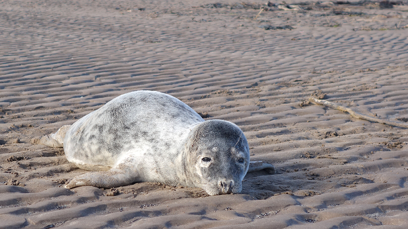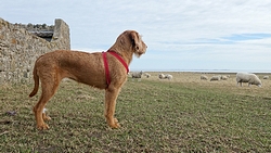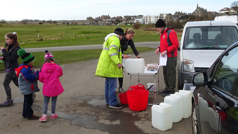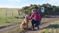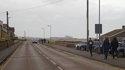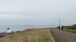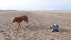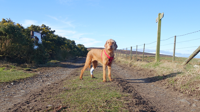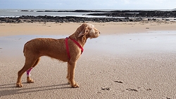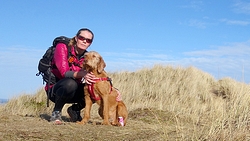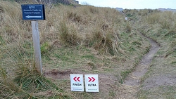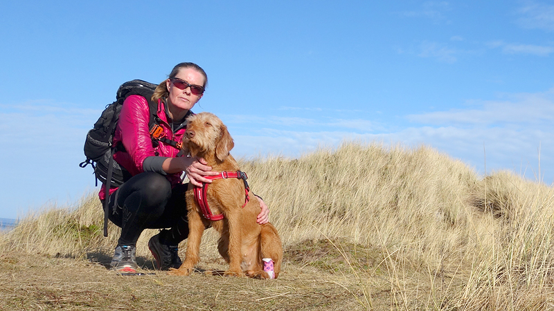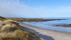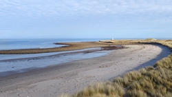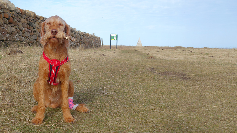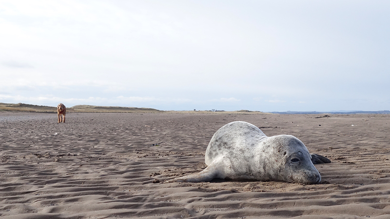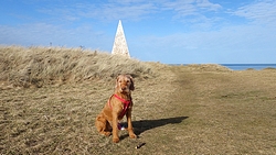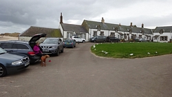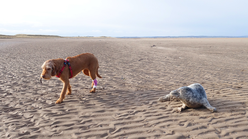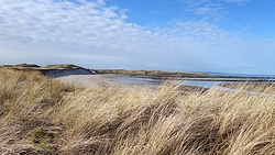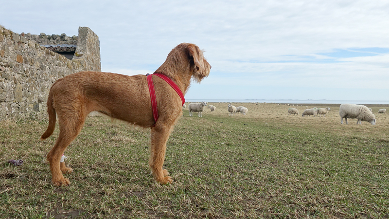 Van Beadnell via de duinen naar Seahouses. Dit traject heb ik niet gedaan tijdens de verkenningen dit jaar. Ik kijk naar het strand en twijfel. Het is heel smal en zal dus zacht zijn. Ik sla linksaf en vervolg mijn weg langs het fietspad. Dat is iets langer en loopt op en neer maar loopt toch beter. Na de golfbaan in Seahouses sla ik rechtsaf en voeg me weer op de route. Door Seahouses en daar zie ik A en S weer. Ik herinner me nog zo goed dat ik hier vorig jaar met wafje liep!