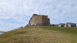 Vlak voor de strand opgang kan ik mijn schoenen wisselen. Ik trek de Stinsons aan en dat is een verademing. De Mafates leken wel klompen. Nadeel van die schoenen is de stugge voorvoet waardoor je niet makkelijk op de voorvoet kunt klimmen. En dat is vermoeiend. Dit loopt fijn. Aanvankelijk even niet bij de steile klim naar het kasteel maar daarna loopt het een stuk lichter en fijner. Op naar het laatste CP dan maar! Even langs de golfbaan, langs de baan, door een camping en naar Budle.