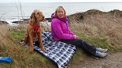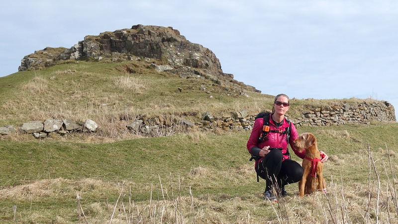 Vreemd genoeg daar geen A. en S. Zou ik ze weer missen? Ik SMS dat ik Boulmer voorbij ben. Ze staan bij Howick. Ah nou daar ben ik nog niet. Ik wil daar wel een drankje en zal wel melden als ik in de buurt kom. Ik hobbel rustig voort en ineens is daar de eerste marathon loper die me achterop komt. Wat een tempo. Als een idioot rent hij me voorbij. Even later nog eentje. Dat betekent dus een sterk veld want vorig jaar werd ik later ingehaald en door 1 loper. Misschien zijn er extra veel lopers, want er was 30% meer ingeschreven. Tsja, alles draait om geld en weer bekruipt me een gevoel van irritatie. Er komen namelijk heel wat smalle paadjes aan en als iedereen je nu wil inhalen ineens, dan loopt dat niet echt fijn. Ik loop verder, langs het mooie strandje met de rots waar ik zo graag even stil stond met woef op onze verkenningen. Nu niet, ik moet doorlopen. Op en neer gaat het pad en ineens zie ik A. met wafje naast het pad zitten en S. staat klaar met mijn drankje. Maar helaas aangelengd met een slokje melk en niet met 200cc dus dat is niet te zuipen. Ik ruk de fles uit zijn handen waar het dopje nog half opgeplakt zit (niks is goed onderweg natuurlijk) en kieper er wat bij en schud. Toch ook dit veel te vroeg op het parcours. Dommie. Ik vervolg mijn weg weer….. Nog een stuk tot Craster. Daar pikte ik vorig jaar de hond op. Dit jaar dus niet en ik vind dat echt heel erg jammer eigenlijk.