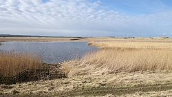 Ik loop door het caravanpark op weg naar Boulmer. Langs de koeien die dit jaar niet op of om kijken en langs het mooie watertje.