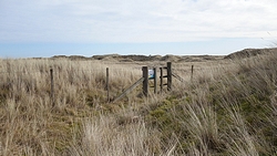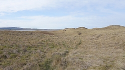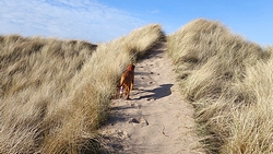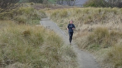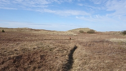 Ik hobbel door de duinen. Dit is een heel rottig stukje met veel konijnenholen en andere rare gaten en hobbels. Omdat ik nog wel een beetje mijn rug voel door die stap in de kuil, kan ik mijn linkerbeen niet zo optrekken zoals ik zou willen. Dat merk je dus goed op dit soort terrein.