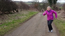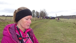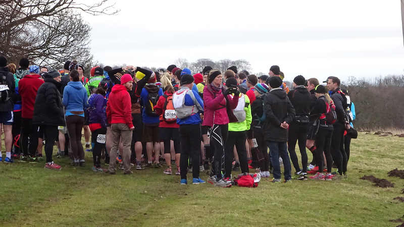 Al mijmerend gaat het toch wel weer snel, want ineens hobbel ik al het grote veld op waar de eerste klim zal zijn. Het is warm geworden. Vreemd, want het is bewolkt. Maar ik heb het onwijs warm en ik moet snel mijn jack uitdoen voordat ik te bezweet ben en meteen kou ga vatten. ijn buff, handschoenen en hoofdband zijn al lang af. Net voor me uit loopt de dame met de rode muts. Ik draai linksaf en zie het grote veld. En ik zie veel lopers. Lopers die zich ook snel omkleden in koelere kleding. Dat ligt dus niet aan mij blijkbaar. Het stel met de honden staat ook naast het pad en de twee mannen ook. Herken ik die nou van vorig jaar? Ik geloof het wel.