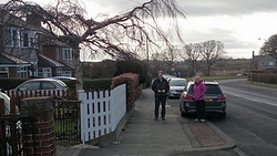 Daar staan A. en S. alweer op de rotonde te wachten. Ik maak een kiekje van hen samen. Waf zit zielig in de auto. Niks an.