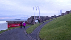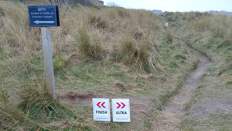 Ineens zie ik de vlaggen van de opgang naar Bamburgh Castle. Daar is de finish! Maar niet voor mij, want ik moet nog een stukje verder. Stom dat ze de route zo leggen want ik zou me kunnen voorstellen dat mensen er de brui aan geven als ze bij de finish komen. Vorig jaar deden aardig wat mensen dat! Ik zie in de uitslagen dat er 9 mensen achter me zijn gefinished, plus 12 uitvallers waarvan 8 mensen zijn gestopt op de marathon afstand. Totaal 109 starters op de ultra (versus 74 in 2014).