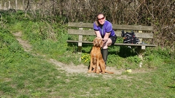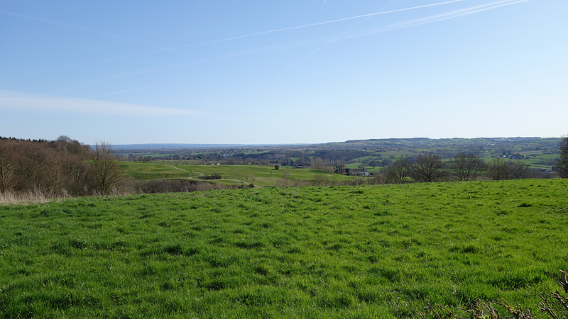 Nadat we even gelopen hadden, kwamen we eindelijk op een stukje open terrein met uitzicht. Het zonnetje erbij maakte alles mooi en vriendelijk. Omdat het zulk heerlijk weer was, besloot ik ergens op een bankje nog even te gaan zonnen en te luieren. Ik was toen alweer vlakbij de tent dus dat kwam goed uit. Mooi uitzicht voor me, geen mensen en een zonnetje. Waf werd er ook helemaal lui van. Overigens ontdekte ik pas later dat het holle pad richting het bankje waar ik overheen was gelopen inderdaad vol zat met dassen burchten! Leuk om een eventuele volgende keer eens in de schemering te gaan wachten op een das!