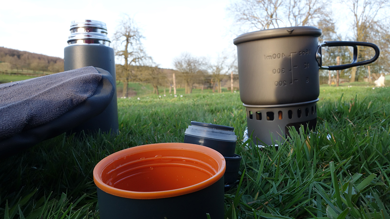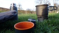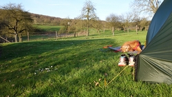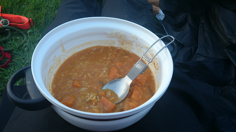 Omdat het zulk lekker weer was, heb ik buiten de tent kunnen zitten tot 21 uur! Ik heb meteen een warme chocoladedrank gemaakt en later kwam iemand me warm eten brengen wat zij zelf over hadden. Dat was heel aardig maar niet nodig op zich natuurlijk. Door de harde wind zat ik aanvankelijk wel even te klooien met mijn vuurtje want het gras vloog bijna in brand door de vlammen die uit de brander sloegen. Dat loste ik op met een groot stuk aluminium folie, maar ik moet toch echt een windschermpje maken uit een blikje zodat dit niet meer kan gebeuren. Overigens had ik nog steeds – ondanks de wind – maar 1 esbit tabletje nodig voor mijn potje dus dat scheelde weer. Ik had ook 4 grams blokjes meegenomen voor de zekerheid maar die heb ik niet gebruikt. Mijn nieuwe Rubytec thermosfles was een succes, want eindelijk had ik gewoon de volgende ochtend nog lekker warm water.