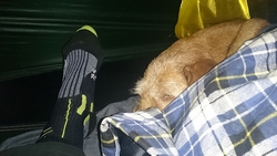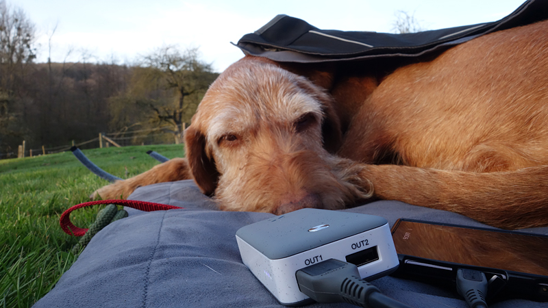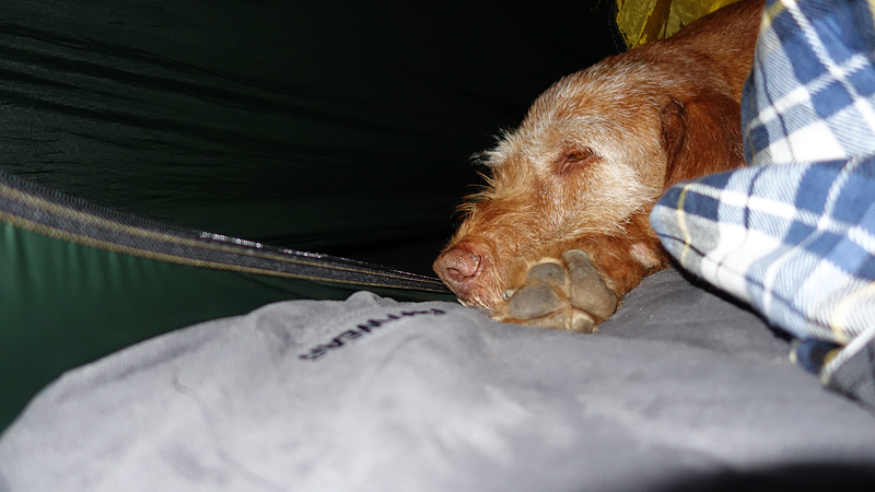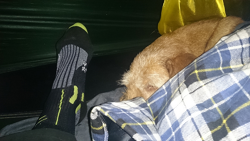 Woef lag buiten de tent op haar nieuwe bedje eerst lekker bloot, daarna met haar cloudchaser jasje aan en uiteindelijk toen het later werd toegedekt met mijn pullover.. Dat was ook wel een succes volgens mij, maar als het winderig wordt, moet er toch iets bij maar daarvoor heb ik de amazonas deken bij me. Die moet ik een beetje kleiner laten maken en dan is het prima zo. Langzamerhand wordt de uitrusting dus compleet. Inmiddels kan ik ook de telefoon opladen met de powerbank. Moet nog even uitpluizen hoe vaak dat precies kan met mijn telefoon.