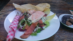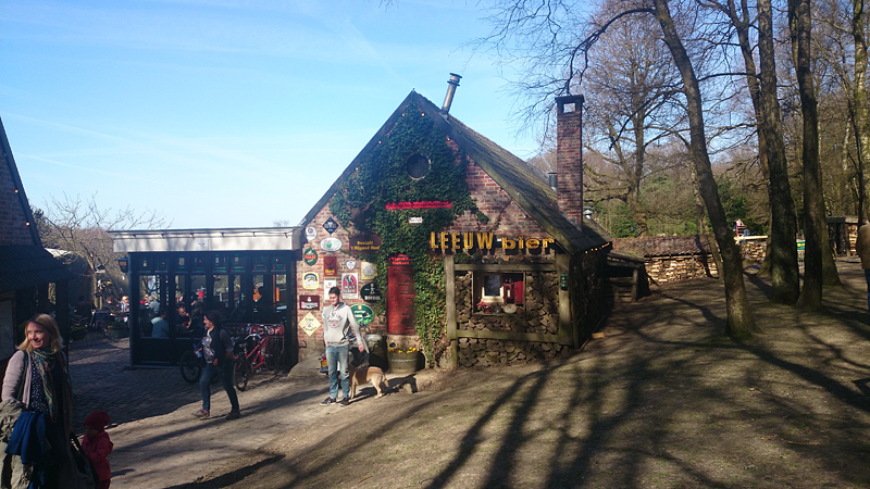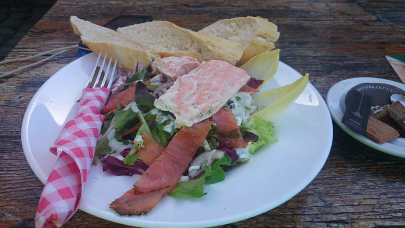 Na 11 km kwam ik aan bij het boscafe. Ik vond gelukkig nog een plekje en heb daar wat gedronken en gegeten. Ik koos een lekkere warme salade met gerookte zalm en warme zalmfilet. Daarna kwam ik een beetje moeilijk op gang natuurlijk maar al snel hobbelden we weer voort. Waf had weer lekker bij gedronken uit haar nieuwe Ruffwear Quencher. Ik merkte nu pas hoe slecht het oude bakje eigenlijk was. Die stortte al in met een beetje water maar deze blijft mooi open staan en is prima op te vouwen in mijn rugzak.