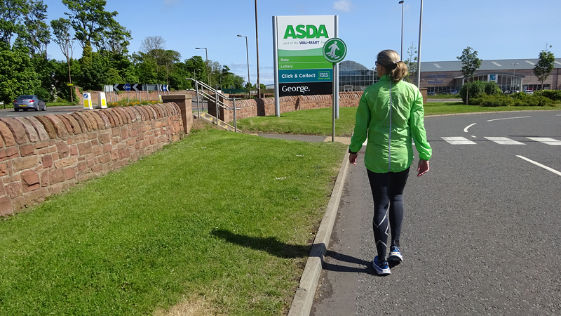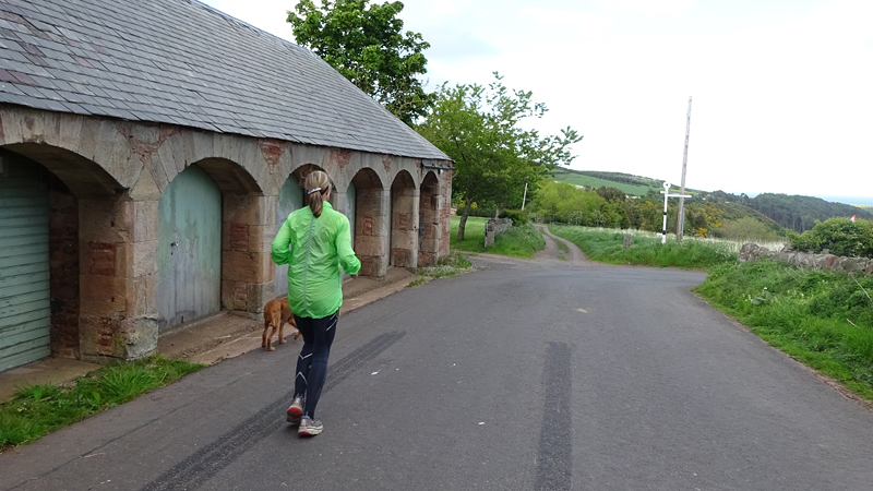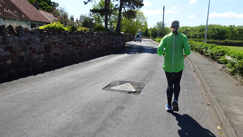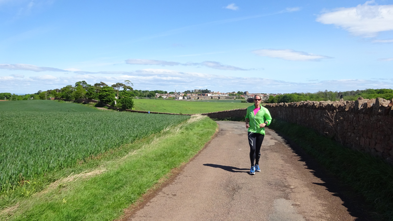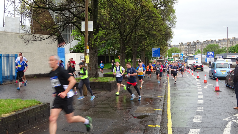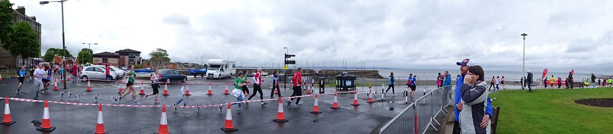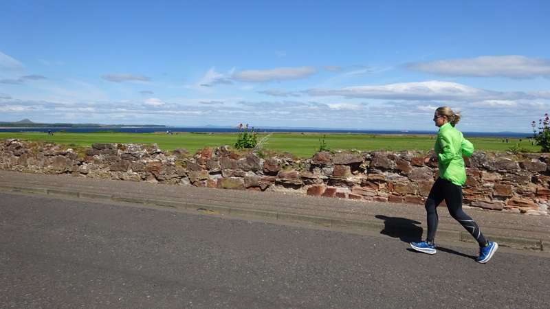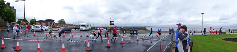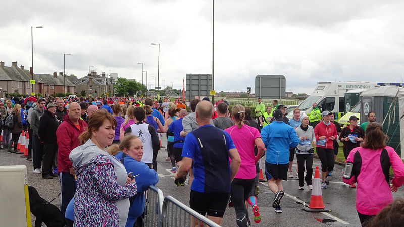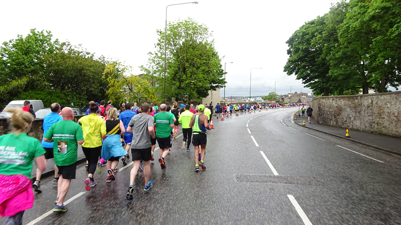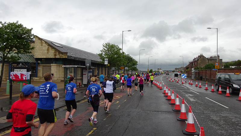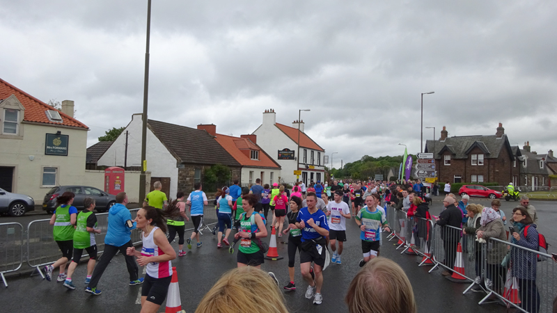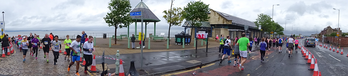 Ik wist dat Musselburgh racecourse nu al snel dichterbij zou komen. Op 15 km langs de racecourse, dan met 16 km bij de rotonde Musselburgh weer uit en dan het heen en weertje dan in 2012 nog zo lastig was. Met 12 km wurm ik mijn softflaskje uit de spibelt tijdens het lopen. Ik raak wel even uit mijn ritme maar ik heb het snel op en ben daarna weer snel in het ritme. Ik kan inmiddels wat beter cadans vasthouden terwijl ik andere dingen aan het doen ben. Toch maak ik een rekenfout, want ik reken met 6 min/km en reken door met een finishtijd van 2.06 terwijl dat niet klopt. De route is 21.22 km en die 220 mtr kost dus meer dan een minuut. Eigenlijk stom, want ik had met 6 min/km moeten rekenen met een basis finish tijd van 2.07.15 ongeveer. Mijn PB is 2.08.29 dus ik kon maar 75 seconden verliezen op het hele stuk. Maar goed… voorlopig liep ik in ieder geval nog mooi vlak en niet zoals in 2012 waar ik van 5.30 min/km over de eerste 5 km al snel wegzakte en uiteindelijk zelfs op 6.35 min/km zou gaan lopen in het vierde blok (!). Nu ging het veel beter dus ik had nog steeds goede hoop op een mooie tijd die nog niet eens moeilijk te halen zou zijn. Omdat dit weer de eerste keer was dat ik zoiets deed, was mijn eerste doel nu mooi vlak te lopen op een redelijk goede tijd. Zou het gaan lukken? Ik loop verder en al snel klinkt het 15 km signaal op mijn horloge. Ik loop door Musselburgh langs de racecourse.