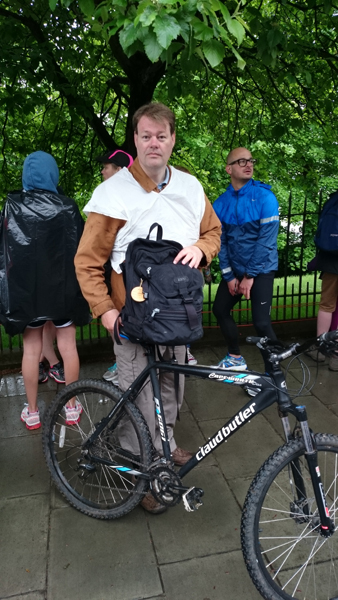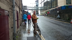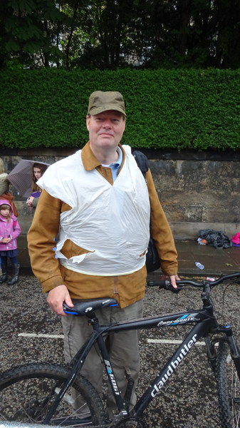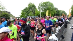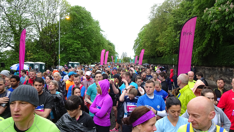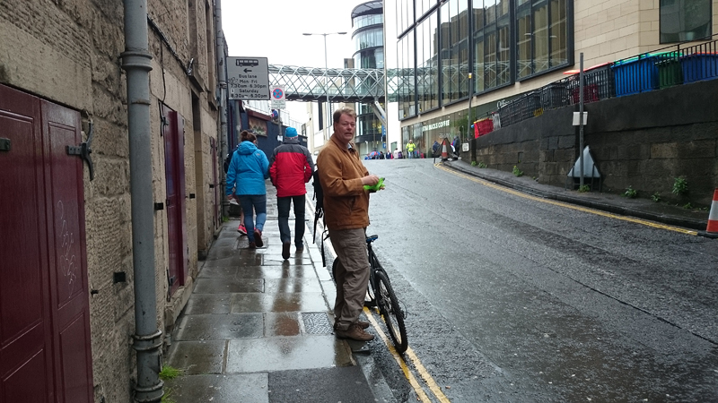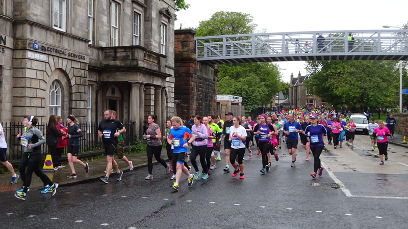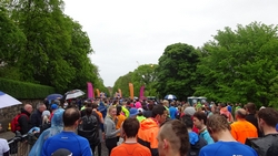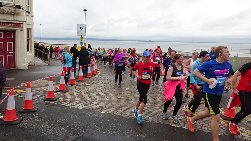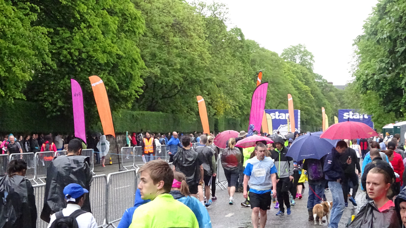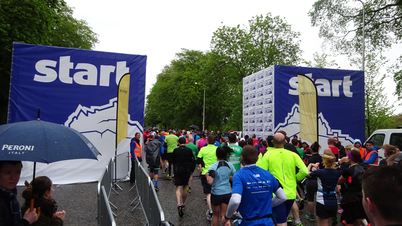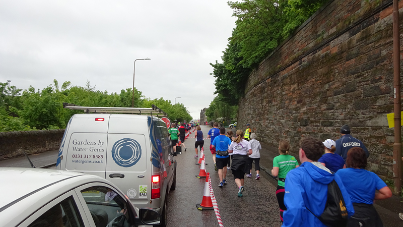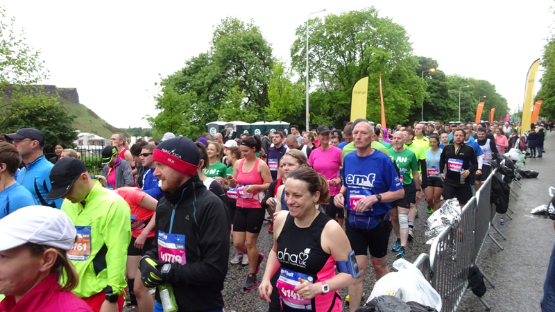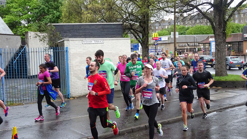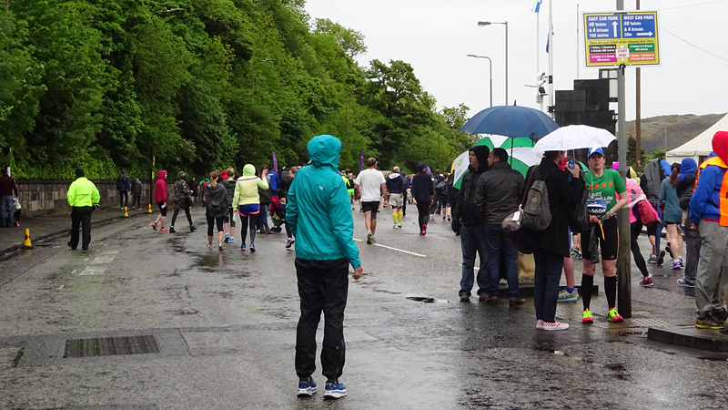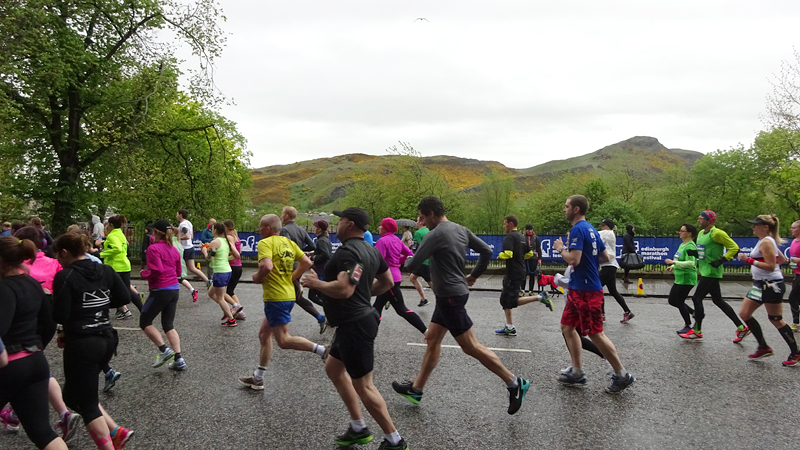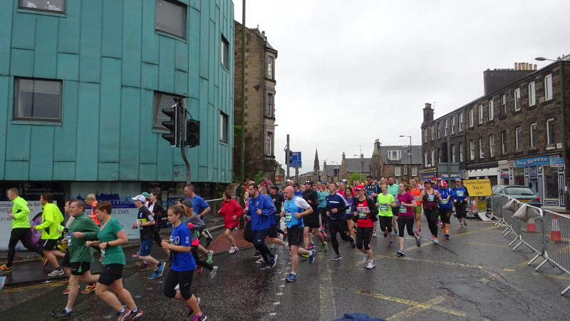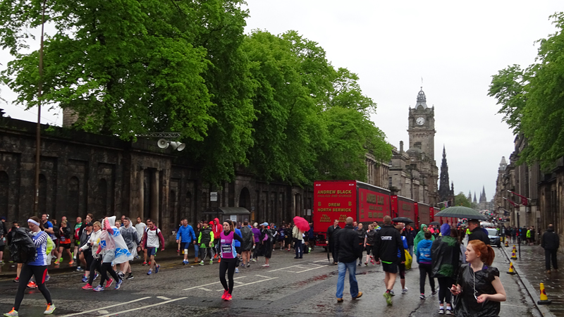 Dit jaar geen poespas rond schema’s en trainingen. Ik heb totaal niet getraind voor een (snelle) halve marathon want ik liep voornamelijk offroad en op MAF. Maar op zich zou dat laatste me niks in de weg moeten leggen voor een goede tijd want het legt een prima basis. Aangezien mijn hartritme me vanaf november 2014 niet meer zo in de steek laat tijdens snellere runs, zou in principe alles op groen moeten staan voor een redelijke run. Fit was ik op zich zeker. Zo mijmerde ik over mijn beste tijd van 2012 (2.08.29) en de tijd van de laatste HM in Terschelling november 2014 (2.14.35) en de Bruggenloop in december 2014 (1.33). Die laatste was geen beste uitslag eigenlijk. In 2015 liep ik alleen de ultra in februari en een 5K en 10K voor de lol op heel lastig terrein. Eigenlijk gingen beide runs wel goed overigens. Wat zou ik dan nu kunnen lopen? Ik dacht niet zozeer aan mijn 2.08 en nam me voor happy te zijn met een tijd sneller dan 2.14 maar helemaal blij te zijn met een 2.10. Met die gedachte ging ik gisteren lekker slapen. We zouden om 6.30 vertrekken naar Edinburgh. Eerst richting Musselburgh om de auto te parkeren bij de finish en daarna door naar de start. D. was weer zo aardig om ons weg te brengen naar de stad en voor het eerst hadden we de fiets ook bij ons in de taxi. Vorig jaar reed D. de hele weg met S. langs het parcours van de hele marathon. Voor niemand eigenlijk leuk en ook niet handig. De fiets leek een prima idee dus zo hadden we het gepland.