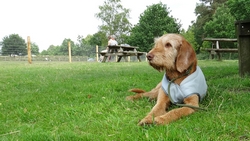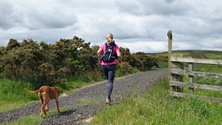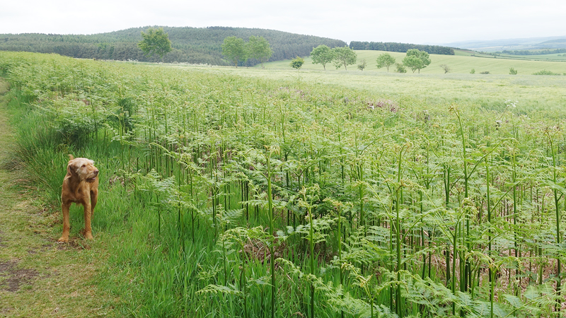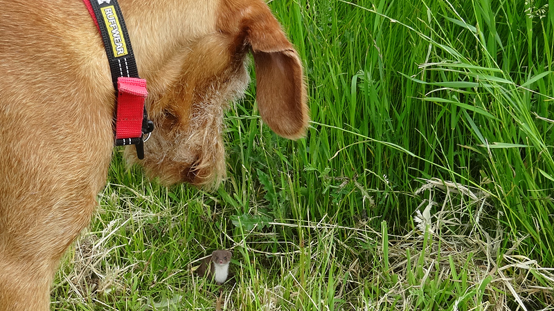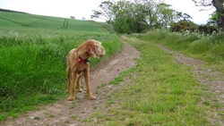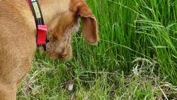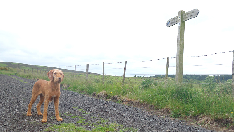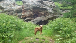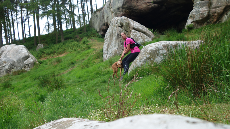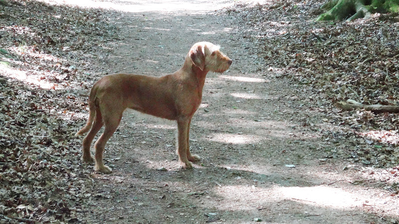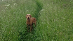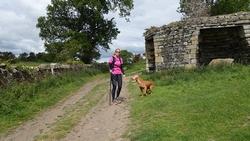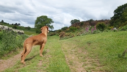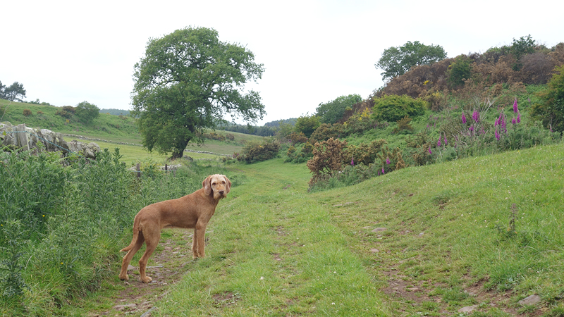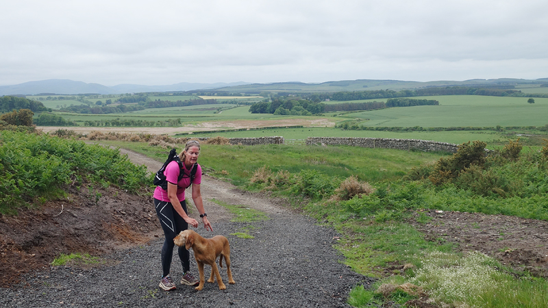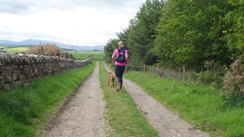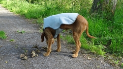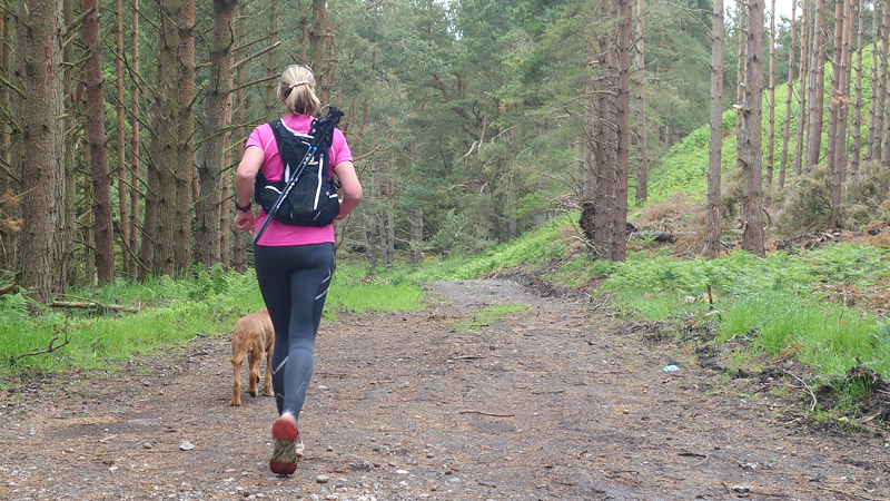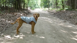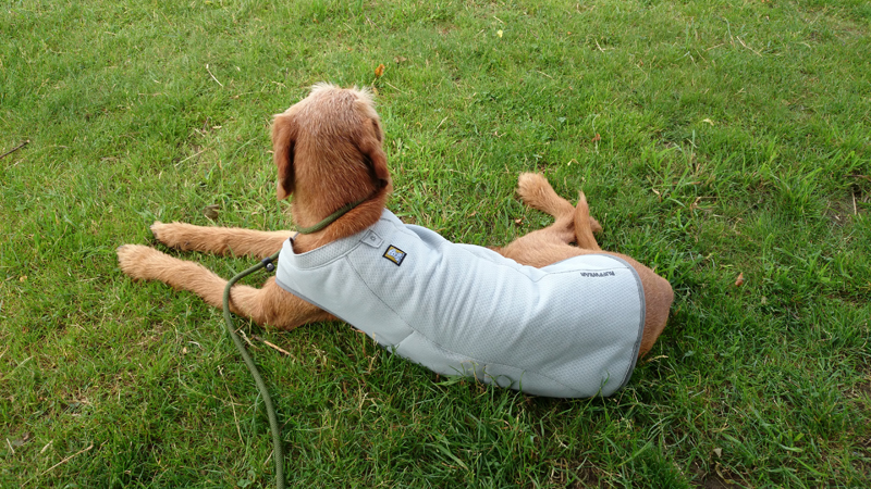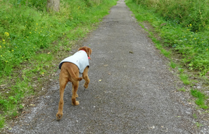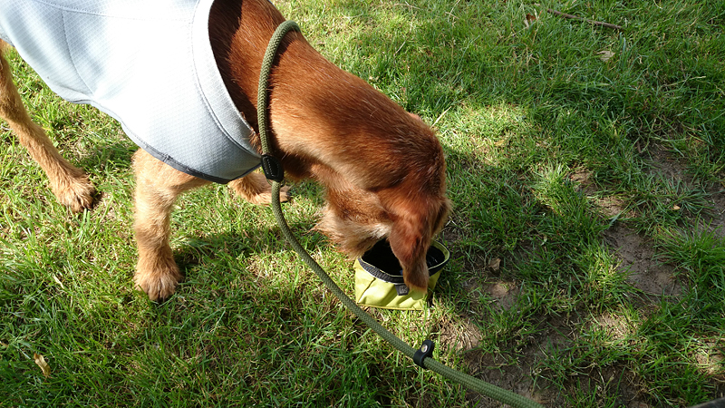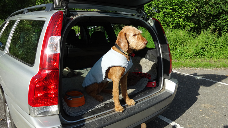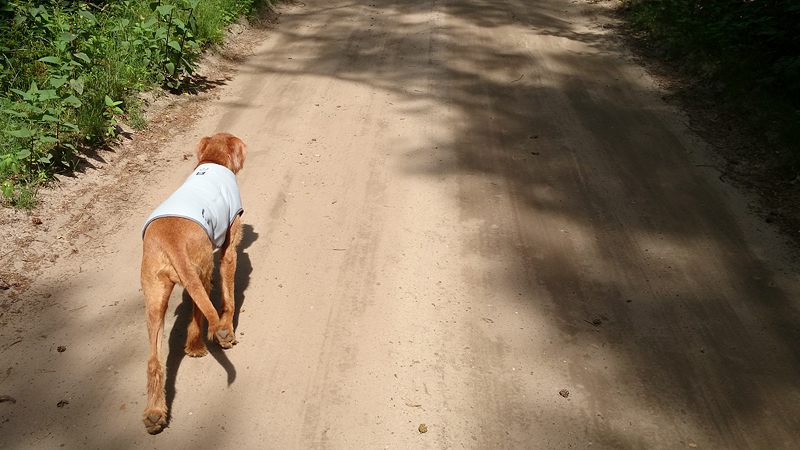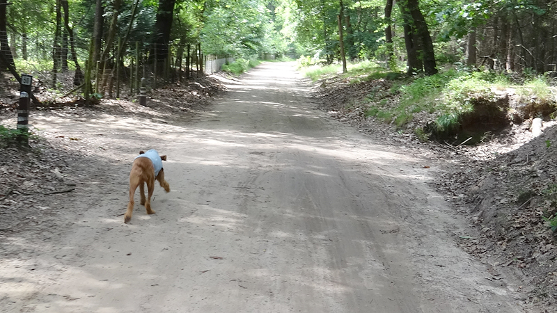 Ik was eigenlijk ontzettend lui en pas om 8.15 waren we dan op pad voor ons rondje. Het was prima koel nog en zeker in het bos! Ik maakte alleen de fout te denken dat woef haar cooljacket dus niet nodig had maar dat was toch niet handig, want het warmde natuurlijk razendsnel op met deze temperaturen. Maar het ging prima verder en al snel waren we op weg.