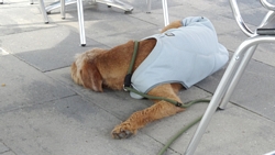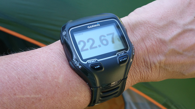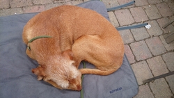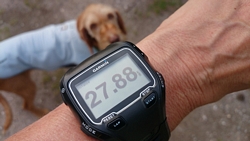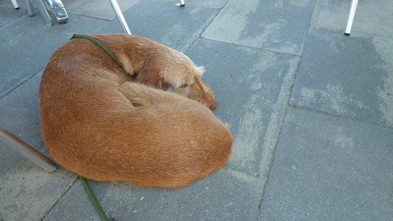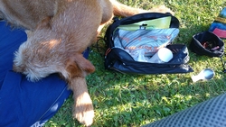 Daarna ligt ze gelukkig weer gewoon rustig te slapen maar het leed is geschied en nu heeft ze helemaal een lege maag. Als ik alles op heb gaan we dus via de kortste en minst warme weg weer heel rustig terug naar de tent. Na bijna 23 km zijn we daar en krijgt ze te eten en gaat slapen.