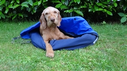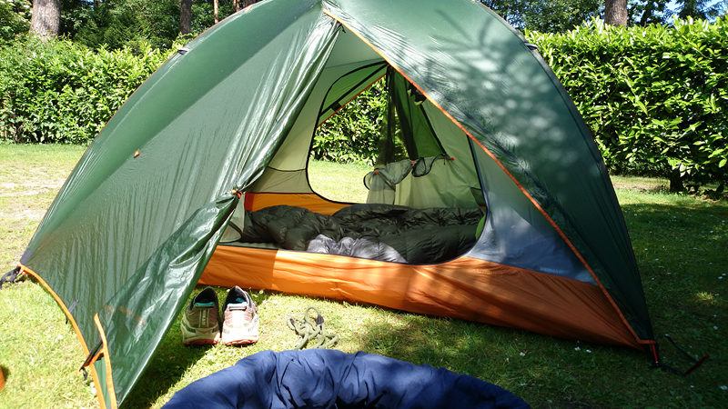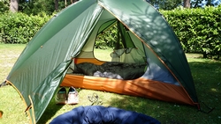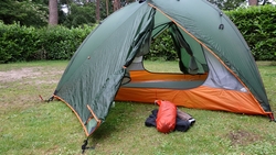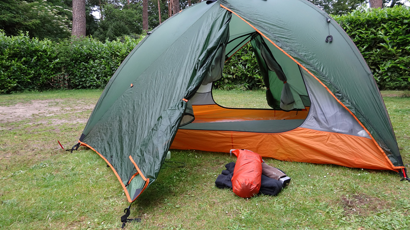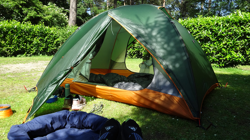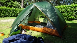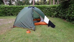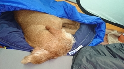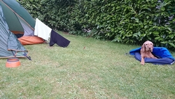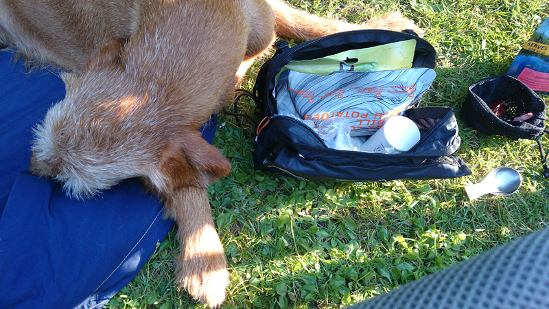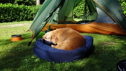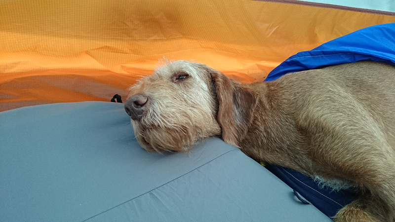 Vannacht heb ik eigenlijk prima geslapen. Het was niet te warm en ik was lekker gekleed in mijn katoenen ondergoed. Voor het eerst dus zonder lange broek of trui! De zomerslaapzak had ik als quilt een beetje over me heen gelegd. Ook nu weer het voeteneind van het matrasje in de zak geschoven en dat voelde fijn. Woef heerlijk in haar Noblecamper slapend als een roos. Ik was wel vroeg wakker omdat ik even naar het toilet moest maar daarna viel ik weer heerlijk in slaap totdat de vogeltjes keihard gingen fluiten. Dat is wel een mooi geluid zo. Heel zachtjes de wind en dan al die vogels om je heen. Verder niets…. Naast me een tevreden slapende waf en verder weinig troep om me heen. De nieuwe grote Villain waar ook weinig inzit en verder niks. Heerlijk.