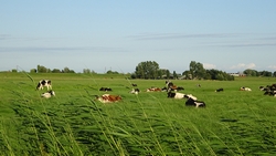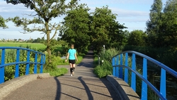 Vandaag een rondje zonder woeffie. Ze is prima, maar het is nog steeds warm en ik doe haar niet echt een plezier met een rondje door Hitland. Dus vertrek ik zonder haar en dat voelt gek. Het geeft me wel de mogelijkheid om lekker te lopen zonder op te hoeven letten en dat is op zich ook wel OK voor een keertje. Als ik bezig ben met de warming up, zie ik een fuutje met een visje zwemmen. Zouden er weer jonkies zijn? Ik hang over de brug om te kijken en zie een piepklein pulletje met een ouderdier. Wat schattig. Ik heb al andere pulletjes gezien van de tweede leg maar nog geen fuutjes. Jammer genoeg heb ik geen fototoestel bij me, maar ik ga vanmiddag nog wel even wandelen met woef hier om te kijken of ik ze zie. Met een glimlach op mijn gezicht vervolg ik mijn weg. De zon schijnt, er is af en toe een klein wolkje en naast me staan jonge stiertjes lui te herkauwen in de wei. Als het lopen zelf nou ook nog een beetje gaat, dan vermaak ik me wel onderweg want er is genoeg te zien.