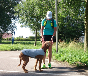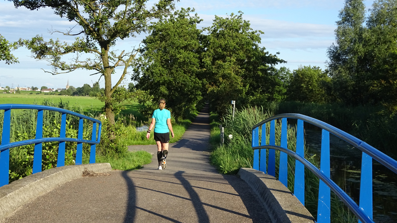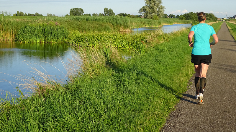 Ik maak een lusje door het natuurgebied en loop weer verder over de dijk. Uiteindelijk sla ik linksaf en maak weer een lusje door het oude deel van Hitland. Daar fietst een grote groep ouderen en ik word bijna de berm ingedrukt. Als ik uiteindelijk in een gat even aan de linkerkant kan gaan lopen, haalt iemand me in op de fiets en vraagt of ik een zak bloed op mijn rug heb. Haha wat leuk. Eikel. Gewoon wat water en de Lafuma zit prima. Geen beweging, niet te warm en geen rare schuurplekken. Ik geloof dat ik het wel wat vind eigenlijk! Het rugzakje zit in ieder geval veel mooier dan de Nathan en er kan meer in als ik dat zou willen. Ik heb nu alleen maar water bij me en een bandje om mijn gezicht mee te wissen.