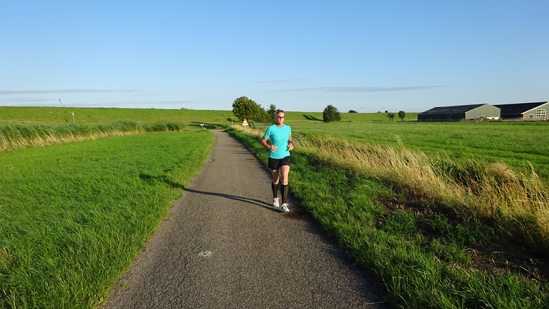 De klim de dijk op is even steil en daar ga ik net buiten MAF helaas maar ik ben weer razendsnel terug gelukkig. Ik loop rustig door, probeer cadans op mijn ademhaling af te stemmen. Vreemd genoeg lukt dat op zich wel maar zie ik na afloop dat de cadans toch eigenlijk te laag is met een 168 gemiddeld (max 172). Dat is dus veel lager dan eergisteren waar ik een veel hogere cadans liep (bij hogere snelheid ook). Maar het voelde verder allemaal prima dus vooruit maar. Ik merk ook weinig drift naarmate de afstand vordert ook al is het soms erg warm als de zon ineens op mijn gezicht schijnt.