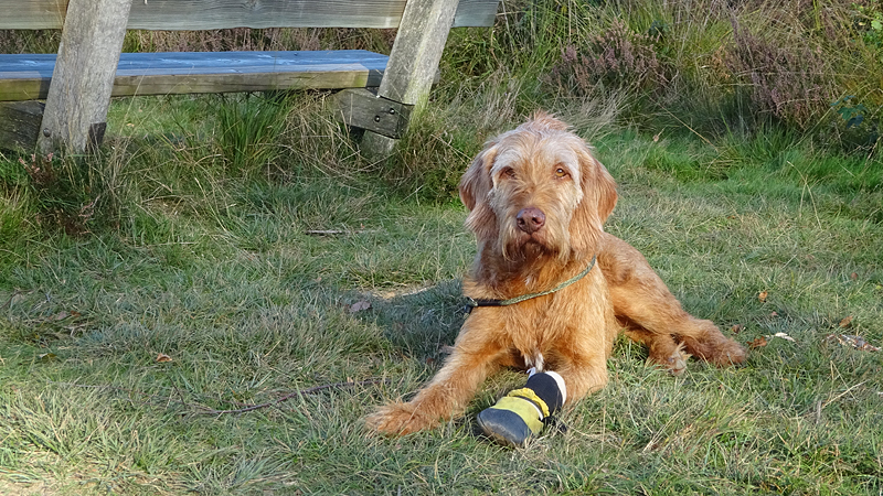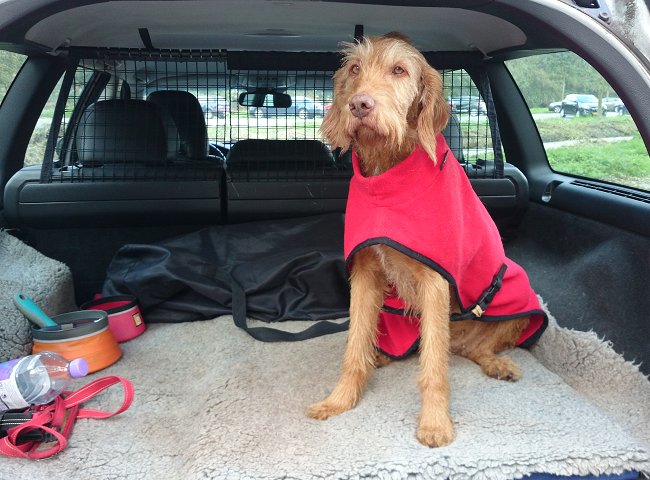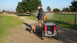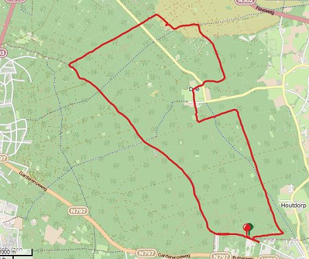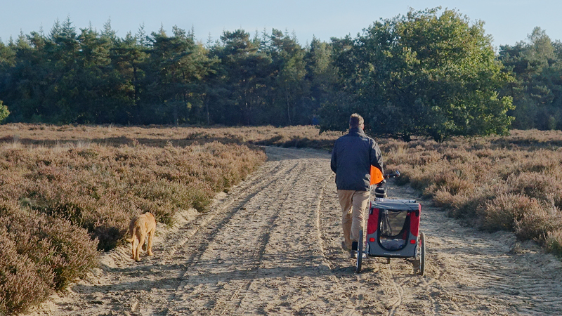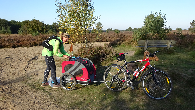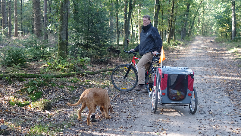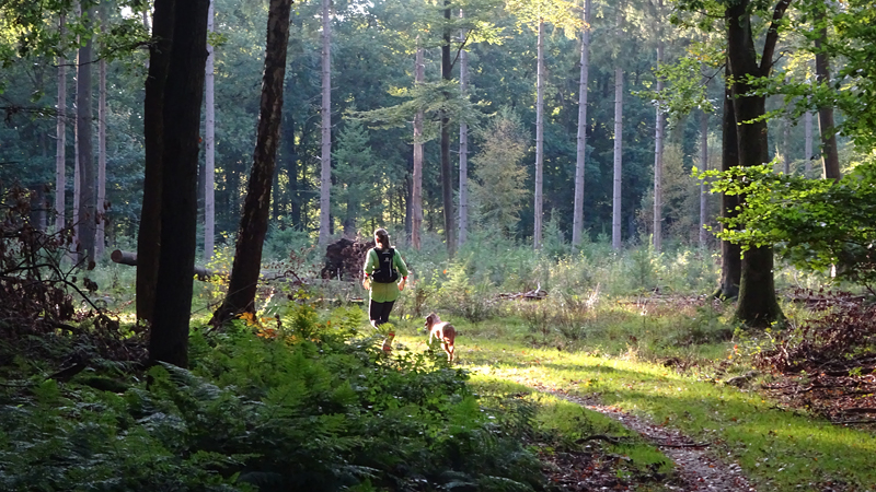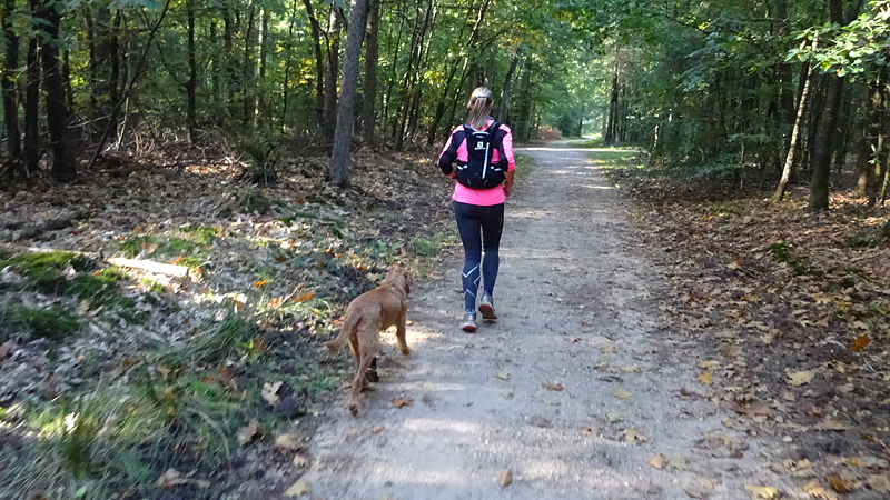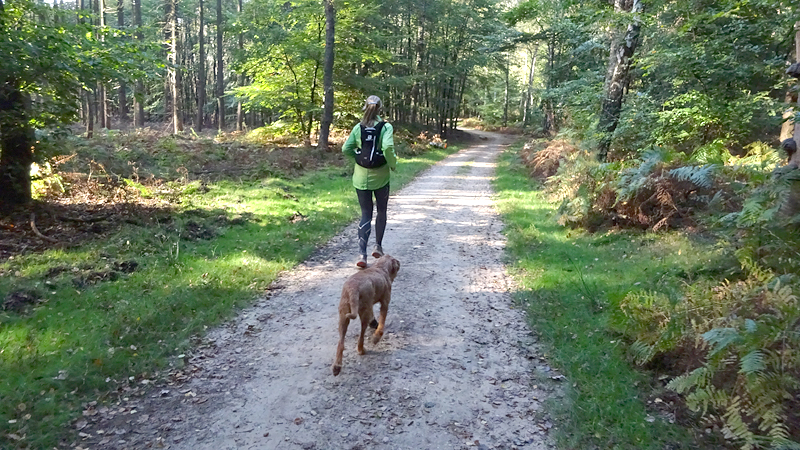 Vorig weekend waren we beide dagen in Garderen en dat beviel prima. Het was toen stralend weer met een blauwe lucht, vandaag was het heel vochtig maar doordat er geen wind was, voelde het eigenlijk heel fijn aan om te lopen. De temperatuur was vrij laag met een graad of 9. Wederom hadden we ook hoop op de herten in het gebied dichtbij de run maar helaas. Weer niks! Na het herten kijken (of liever gezegd ‘niet kijken’) reden we weer naar het Speulderbos voor ons rondje. Zonder kar deze keer, want ik ging ervan uit dat woef het nu prima zou doen (klopte ook) en bovendien was het door alle regen van de afgelopen tijd ook nog eens knap modderig dus zou de kar ook niet zo handig zijn geweest onderweg.