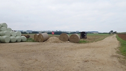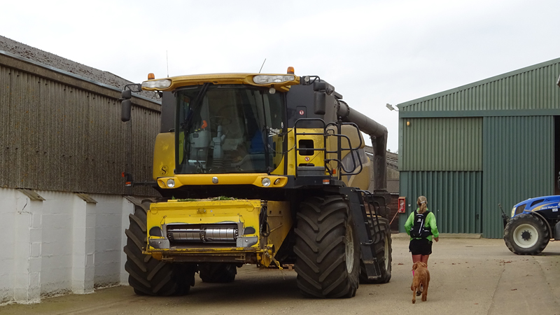 We maken nog even een opname van een van de landbouwmachines op het veld. Als ik weer over het erf loop, maakt S. een foto als ik langs een van de machines loop. De wielen zijn net zo groot als ik!