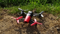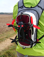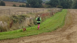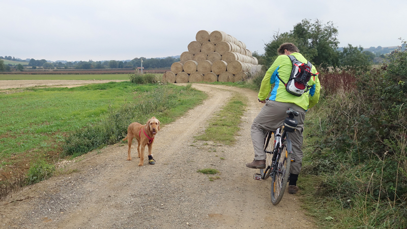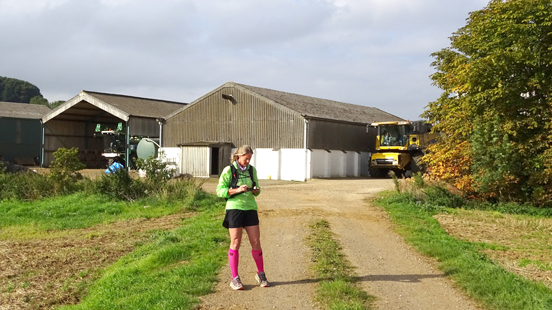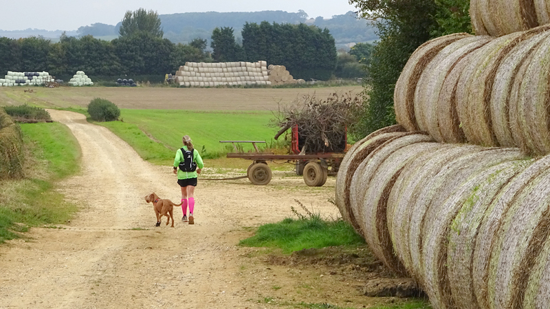 Als we op Platts Lane zijn, brengen we de farm nog even in beeld met de drone, en proberen daarna opnames te maken van een soort ruine verder weg in het veld. Maar door de afstand en het licht wil dat niet zo lukken. Woef rent keihard heen en weer en heeft het reuze naar haar zin. We missen de kar dus totaal niet. De drone zat aanvankelijk nu achterop mijn rugzak, wat prima gaat overigens maar na de eerste opname bevestigen we de drone achterop de rugzak die S. bij zich heeft. Dat gaat ook prima.