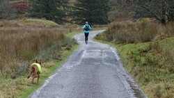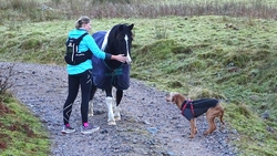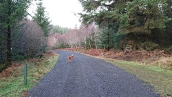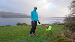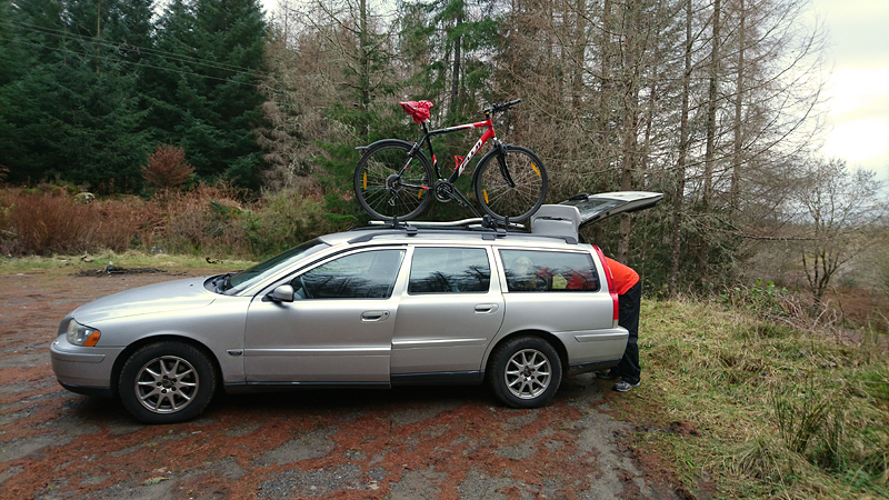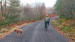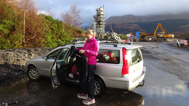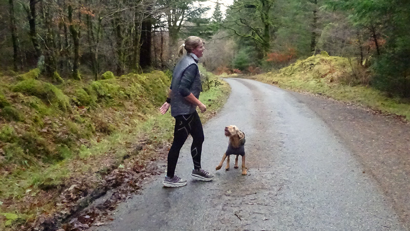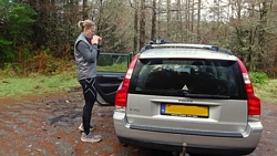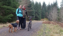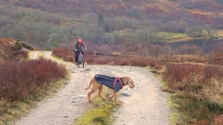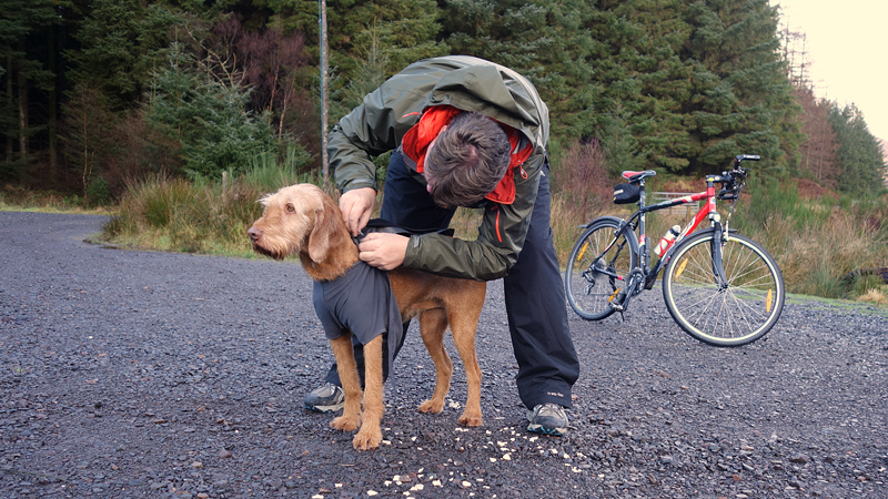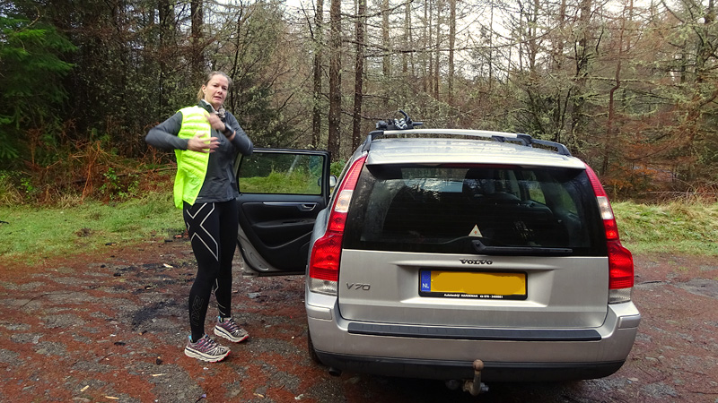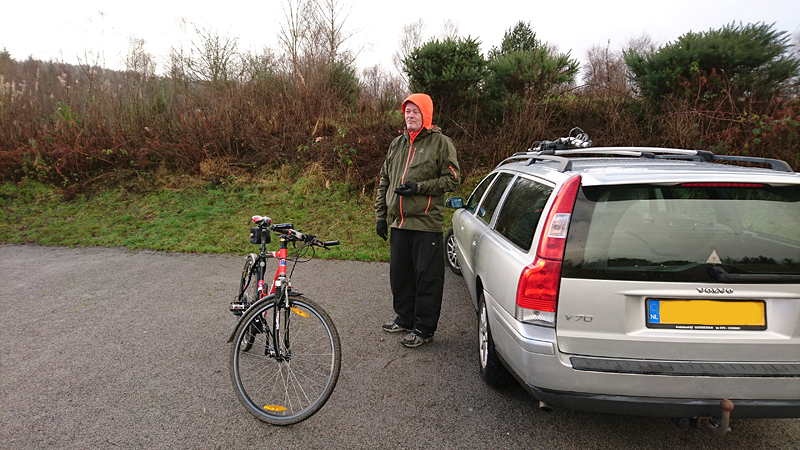 Maar we hadden dit jaar gezien dat het vandaag mooi weer zou worden dus hadden we al besloten dat we vandaag deze route samen zouden doen. Ik wilde het mooie piertje zo graag aan S. laten zien! We twijfelden alleen een beetje aan de fiets want eergisteren had de fiets nog een lekke band en de route vandaag zou nou niet echt over gebaande paden gaan…. We hadden dus een soort strijdplan gemaakt wat we zouden doen als de band weer lek zou rijden….. Maar we gingen dus vol goede moed op pad en parkeerden de auto op de parkeerplaats en maakten ons klaar voor vertrek. Het was inderdaad een mooie dag maar met 3 graden best frisjes zo tijdens de warming up. Ik had dus lekker mijn aeroloft jackje weer aan onder mijn jack en zelfs een beanie op mijn hoofd. Voor woef hadden we de cloudchaser. Daar heeft ze totaal geen last van en het houdt haar net wat warmer zodat ze niet stijf wordt na afloop.