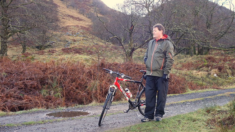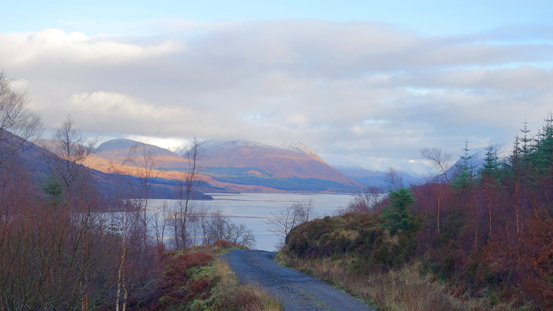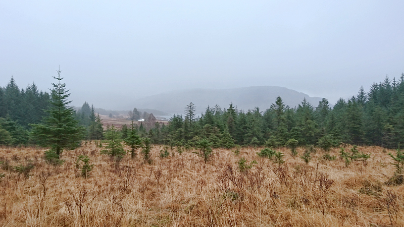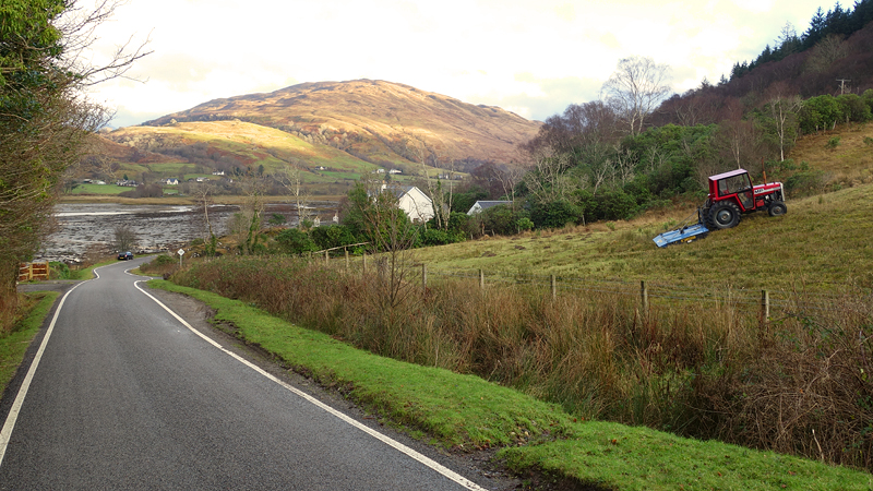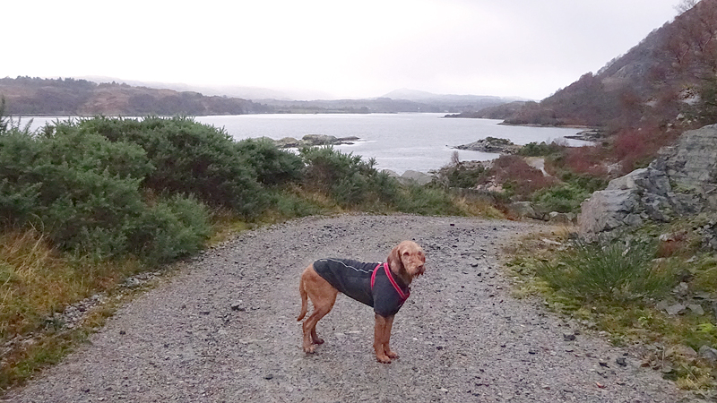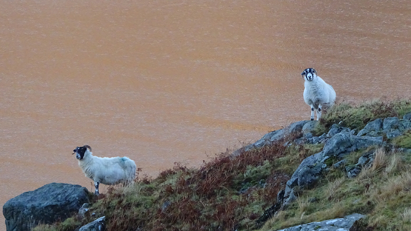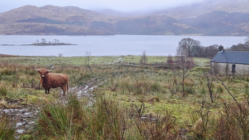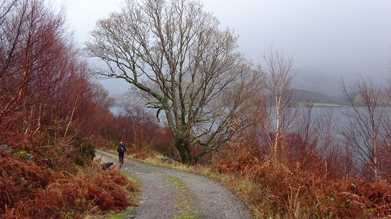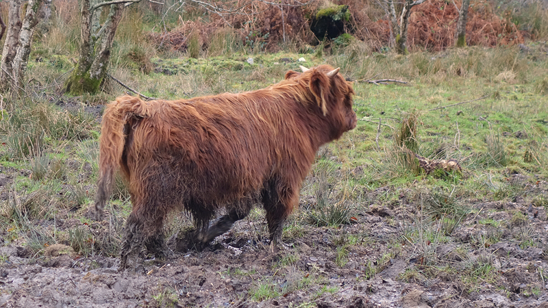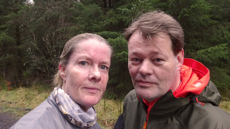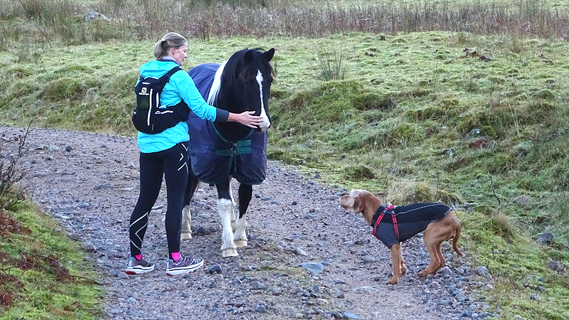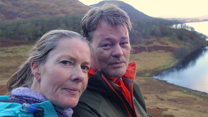 Vanaf nu lopen we een beetje door. Het fraaie licht is toch weg en foto’s hebben we genoeg… Maar het klimmen en dalen valt niet echt mee. Het loopt prima maar op de fiets is het ook zwaar natuurlijk. Toch hebben we gelukkig wel wat herkenningspunten onderweg waardoor het allemaal niet zo ver lijkt… De schapen, het huisje en dan de plek waar het paardje los liep. Daar praten we eventjes met de eigenaresse die net het paard aan het voeren is en ze vertelt dat ze eigenlijk wel weg wil daar. Ze noemt het ‘met de beauty komt het beast’…. om daar te wonen moet je voor lief nemen dat je steeds dat hele gebied in moet rijden over een weg die eigenlijk geen weg is (met een slagboom ook nog eens want het is helemaal geen weg). En als vrouw alleen is het ook te zwaar (geworden). Ze wil dus vertrekken en daar kunnen we ons van alles bij voorstellen. Zo met de kano aankomen en een nachtje slapen op de oever lijkt me geweldig maar voor meer dan een nacht zou het niks voor ons zijn denk ik, hoewel ik zowel van natuur als van stilte hou. Maar er zijn grenzen…..We nemen afscheid en lopen weer verder.