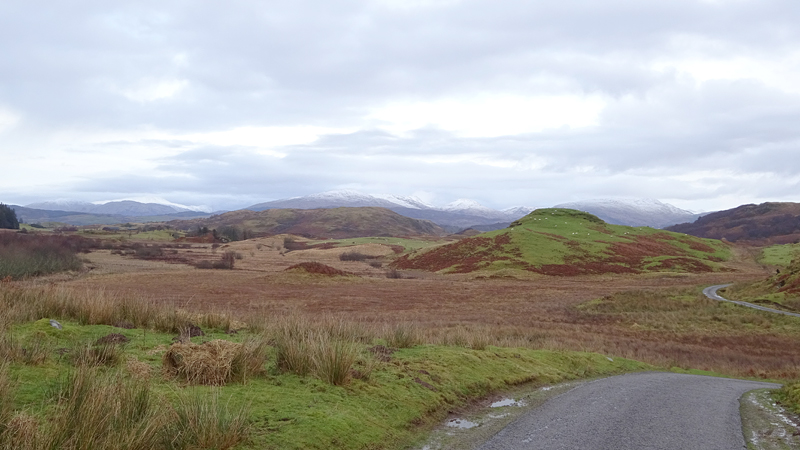 Even verderop is het ook weer prachtig. Je kunt zo ver en weids kijken omdat de weg aardig stijgt op sommige punten. Dat is erg mooi en al helemaal met de besneeuwde bergtoppen en het zonnetje. Het lopen gaat verder prima maar het valt niet zo mee op het fietsje. Maar S. slaat zich er dapper doorheen en geniet wel van de omgeving. We hebben hier ooit een stukje gewandeld maar toen kwamen we niet zo ver!
