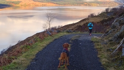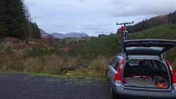 Dan komt het laatste stukje al in zicht. De klimmetjes en daarna weer langs het bootje. Vanaf daar dus nog maar 3 kilometertjes. Dat laatste stukje is nog even vervelend met steile klimmetjes en rollende stenen en het allerlaatste stuk is misschien niet zo handig met de fiets. Inmiddels is de zon achter de bergen verdwenen. Wat een prachtige dag hebben we gehad. Pakken wat je pakken kunt (of carpe diem, dat klinkt wat vriendelijker) en dat hebben we vandaag dus ook gedaan. Nog even snel een kiekje achter ons van het laatste uitzicht…en dan de fiets weer op de auto zetten. Ik doe nog even snel een cool down.